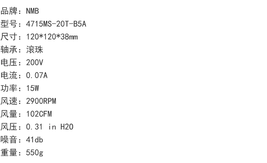 Product Description: The New NMB 4715MS-20T-B5A is a reliable AC cooling fan designed for industrial applications such as UPS (Uninterruptible Power Supply) systems and machine tools. With a standard 120x120x38mm frame size, this fan operates on 200V AC with a current of 0.07A, consuming 15W of power. It features a durable ball bearing for long-lasting performance and achieves a speed of 2900 RPM, delivering an airflow of 102 CFM and a static pressure of 0.31 in H20. The noise level is a relatively low 41 dB. Weighing 550g, this NMB fan provides a balance of performance and quiet operation for demanding environments. Key Selling Points: Designed for Industrial Use: Ideal for cooling UPS systems and machine tools. Reliable AC 200V Operation: Compatible with standard 200V AC power. Quiet Operation: Low noise level of 41 dB for a powerful fan. High Airflow: Delivers a substantial airflow of 102 CFM. Durable Ball Bearing: Ensures a long operational lifespan. Standard 12038 Size: Easy to integrate into existing 120mm fan mounts with a 38mm thickness. Trusted NMB Brand: A reputable manufacturer of cooling solutions. Application Scenarios: This reliable AC 200V fan is well-suited for cooling: UPS (Uninterruptible Power Supply) Systems: Maintaining optimal operating temperatures for critical power backup equipment. Machine Tools: Dissipating heat from motors, control panels, and other components in industrial machinery. Industrial Control Cabinets: Providing ventilation for sensitive electronic equipment. Telecommunications Equipment: Cooling components in communication systems utilizing 200V AC power. Large Electronic Enclosures: Providing significant airflow for cooling enclosed electronics in industrial settings. Any application requiring a quiet and reliable AC 200V fan with high airflow for industrial cooling. Hot Search Keywords (integrated within the text): AC 200V fan industrial cooling fan UPS fan machine tool fan 120mm fan quiet AC fan high airflow fan ball bearing fan 200V fan NMB fan