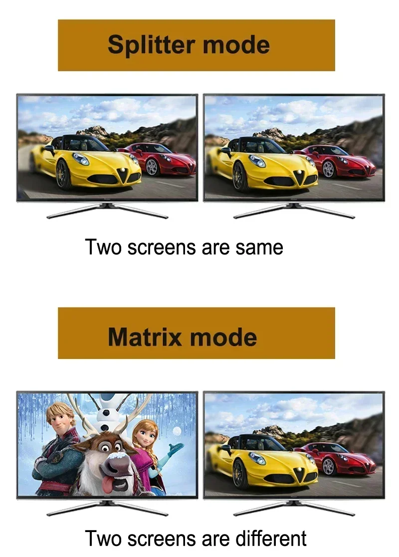1) Hay demasiadas versiones de mouse y teclados USB, no podemos asegurarnos de la compatibilidad, por lo que es estándar Se recomienda un teclado USB con cable de 104 teclas, un mouse USB con cable estándar de 2 o 3 botones. 2) El conmutador Matrix tiene compatibilidad limitada con teclado/ratón mecánico, no recomendamos usarlo con estas versiones mecánicas. 3) Realmente se necesita un cable HDMI 2.0 con certificación HDMI de primera calidad para funcionar con nuestro artículo. 4) Hay miles de fuentes de vídeo y pantallas de varias marcas y fabricantes, No existe un solo artículo que puede admitir todos los modelos.