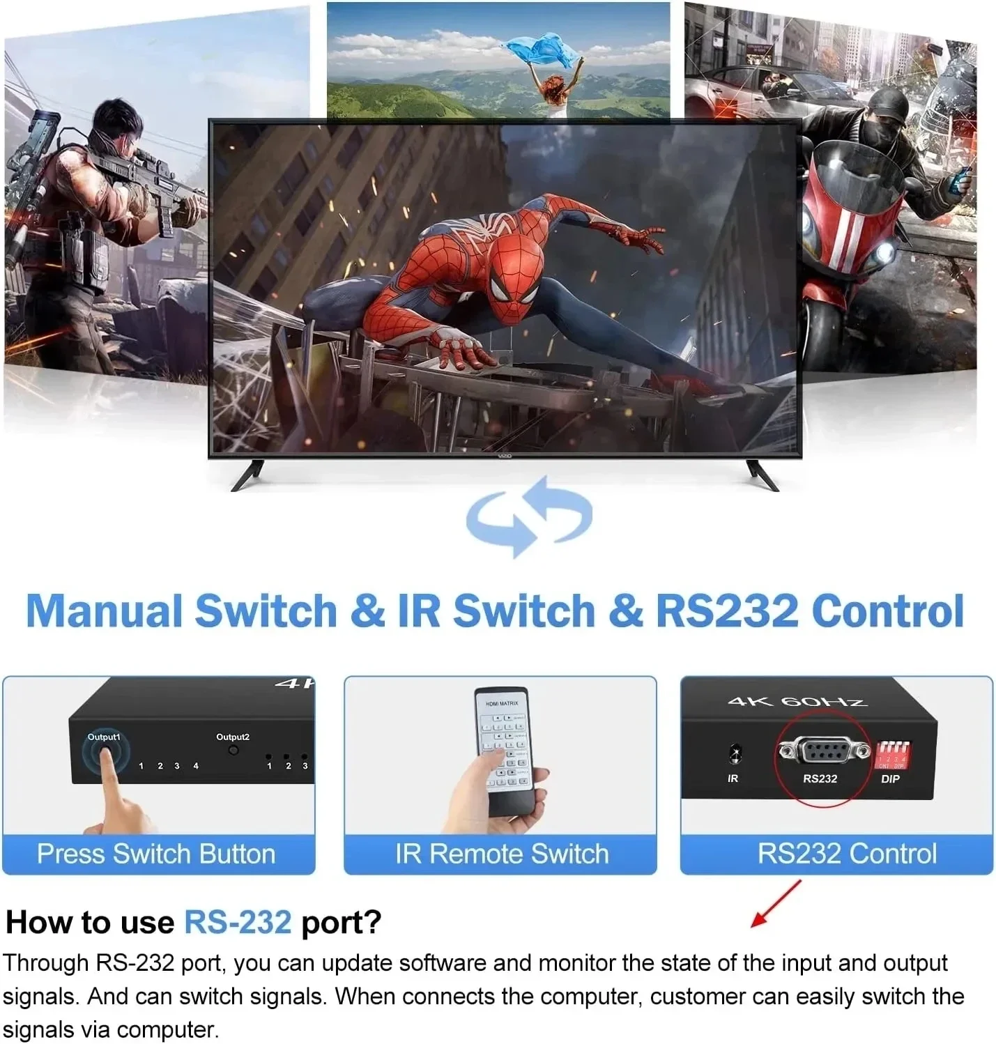 3.Controle el conmutador de matriz a través de RS232 o control remoto IR para satisfacer sus diferentes escenarios de uso.(Solo matriz 4x4 con función)