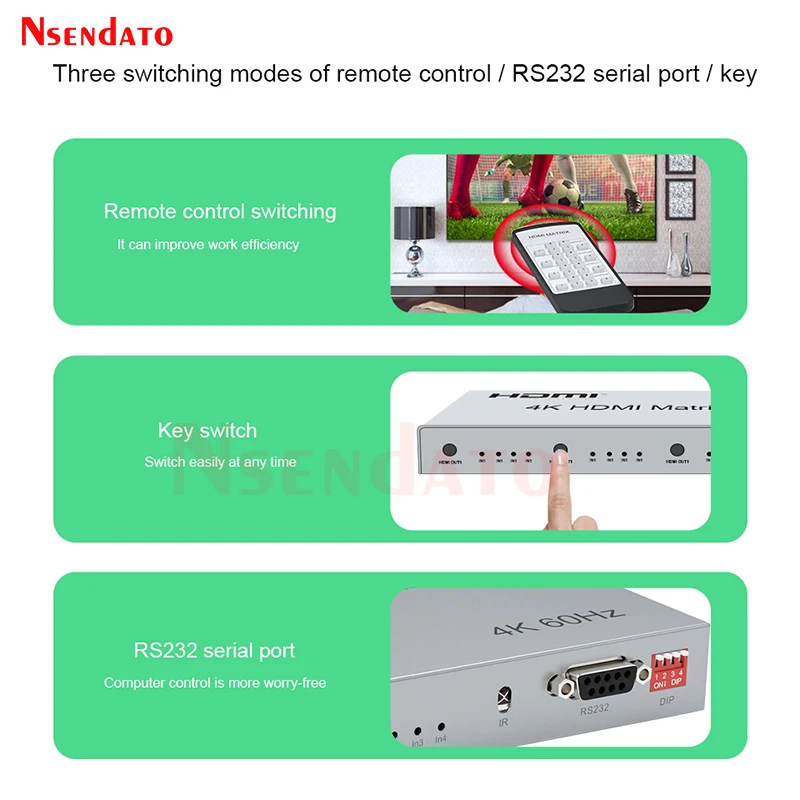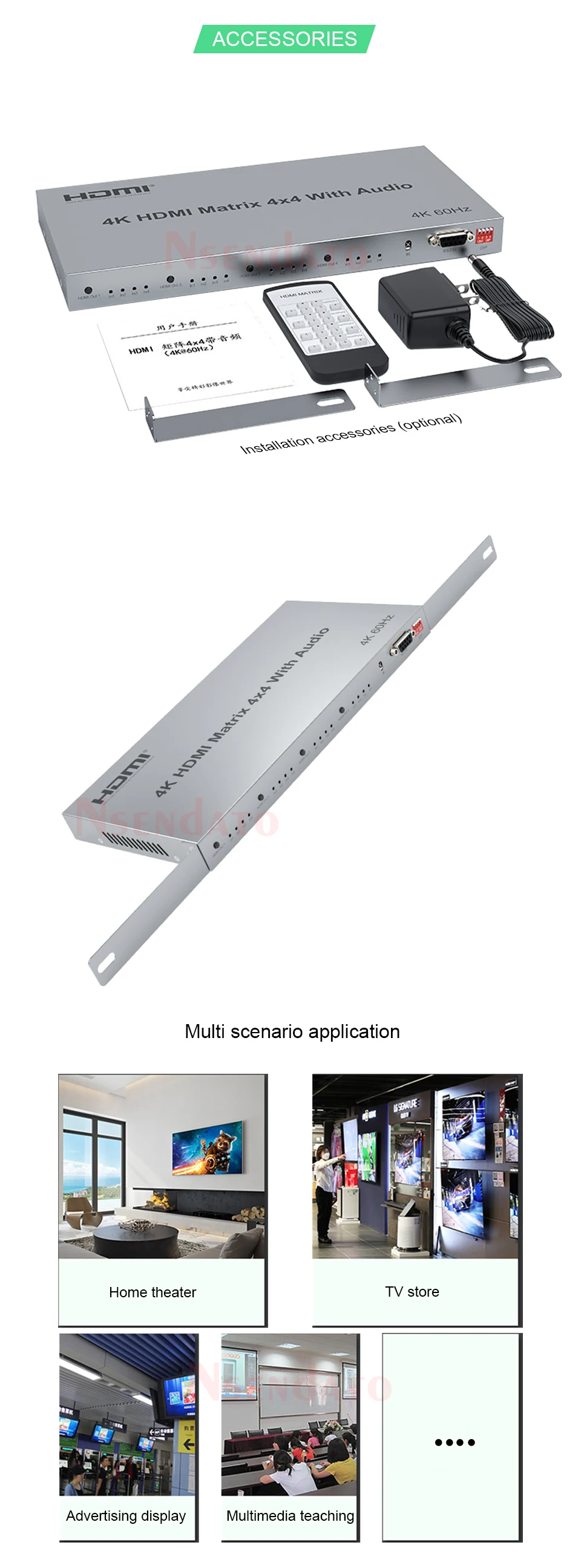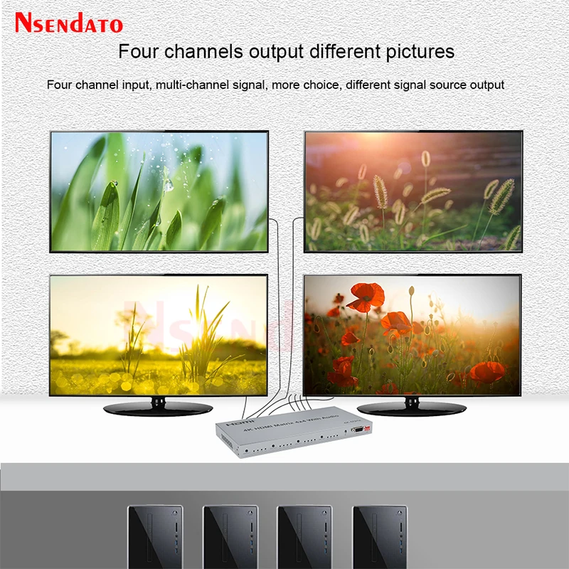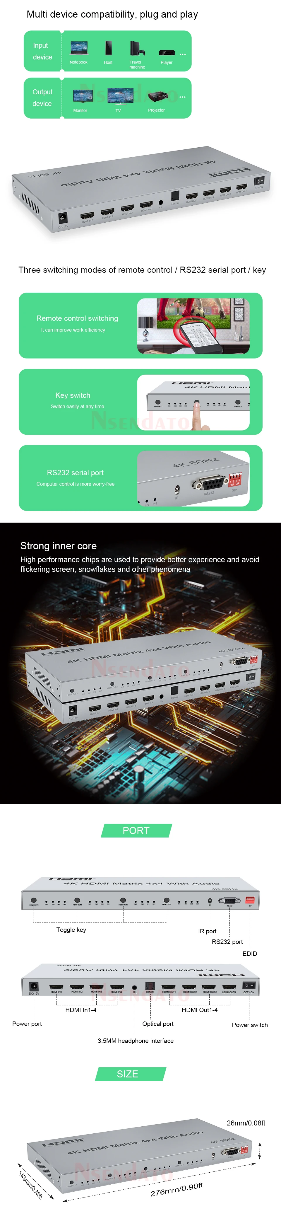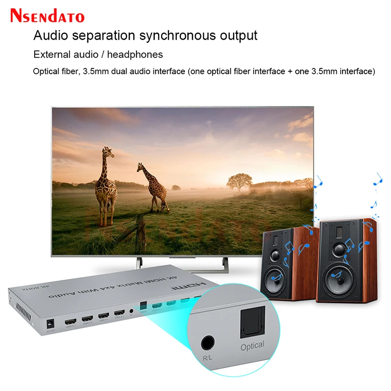 El Nsendato de HDMI matrix 4x4 puede conectar 4 fuentes de señal HD a 4 terminales de pantalla HD con fibra óptica y salida de auriculares estéreo al mismo tiempo a través de HDMI out 1 puerto. La matriz permite cambiar o dividir fácilmente cuatro dispositivos HDMI