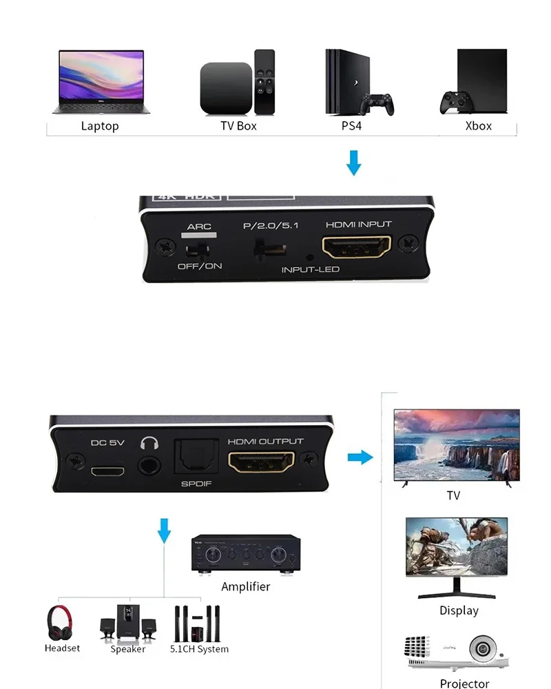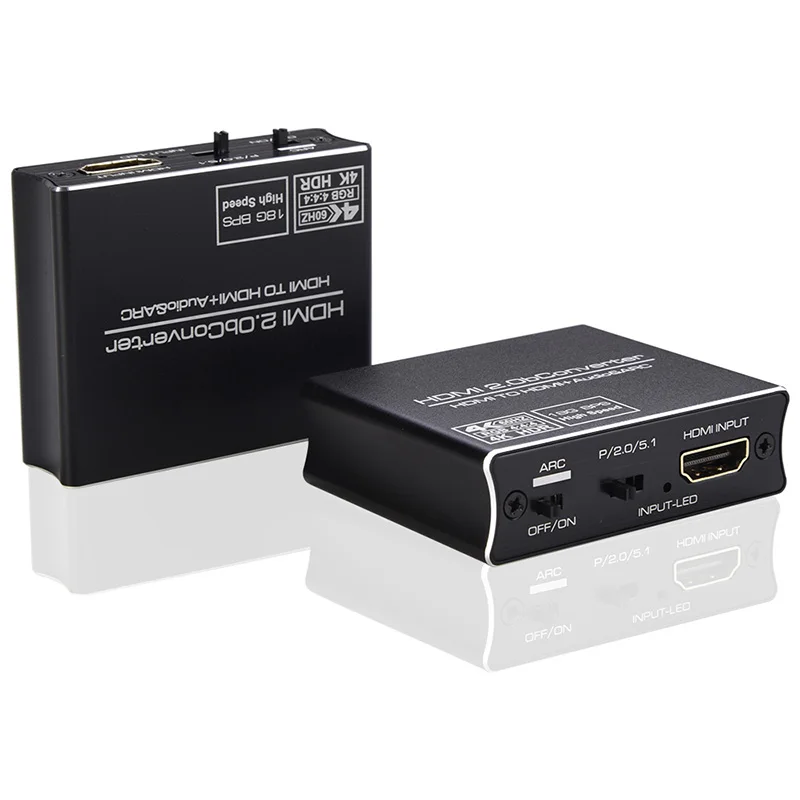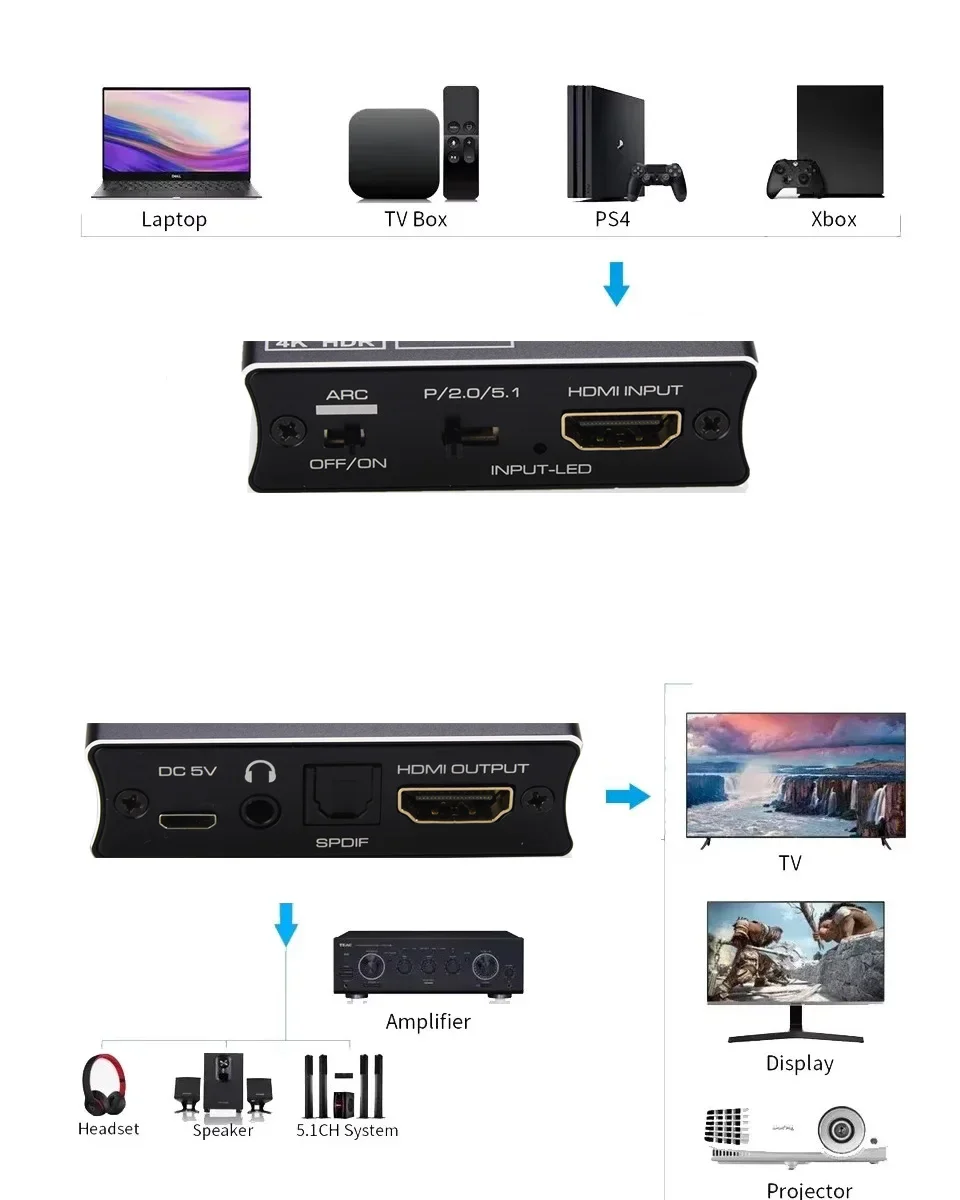 FEATURES: One HDMI input converted to one HDMI+ Audio (SPDIF+3.5mm)output Output audio support: SPDIF+3.5mm analog Audio Output Input Resolution: up to 2160p60 HDMI to achieve the synchronization of audio signal separation. There are PASS / 2.0CH / 5.1CH three kinds of audio mode options LED indication: when source or sink is working, LED relative to is light. No loss of quality Easy to use Need DC5V power supply Support ARC