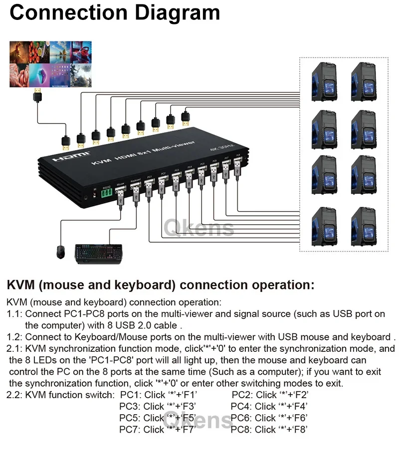 * Admite 8 entradas HDMI, 1 salida HDMI; * Admite segmentación de pantalla de señal HDMI de 8 canales; * Admite resolución 4K@30Hz/1080P/720P/1024*768/1360*768, etc.; * Admite control IR; * Admite mouse y teclado unidireccional para controlar el host de PC de 8 vías; * USB es compatible con Windows, Linux, MAC OS y sistemas operativos Android, etc. * Admite control RS232; * Admite USB 1.1 de baja velocidad (1,5 Mb/s); Velocidad máxima (12 Mb/s);