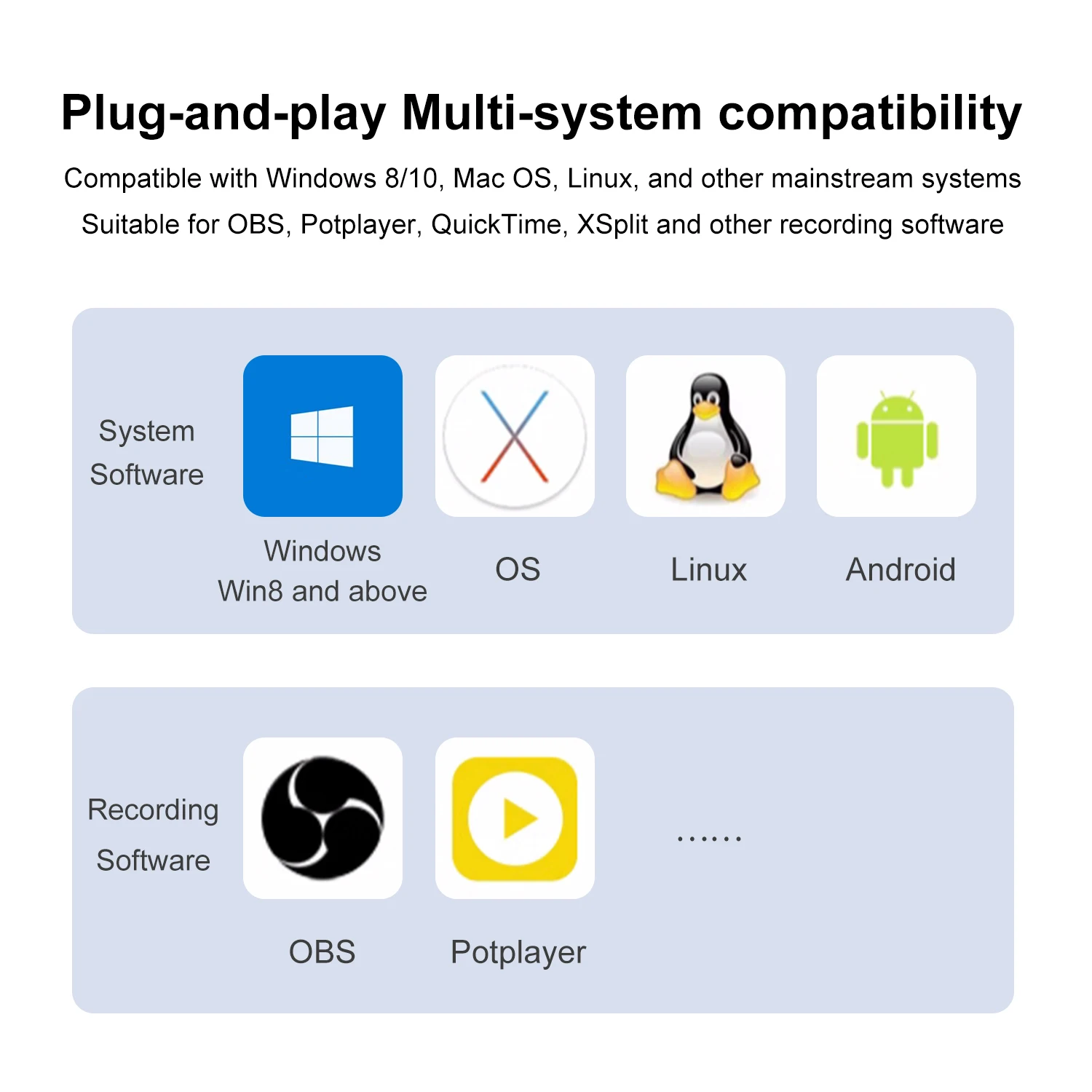 * Adecuado para OBS, Potplayer, QuickTime, XSplit y otros software de grabación;