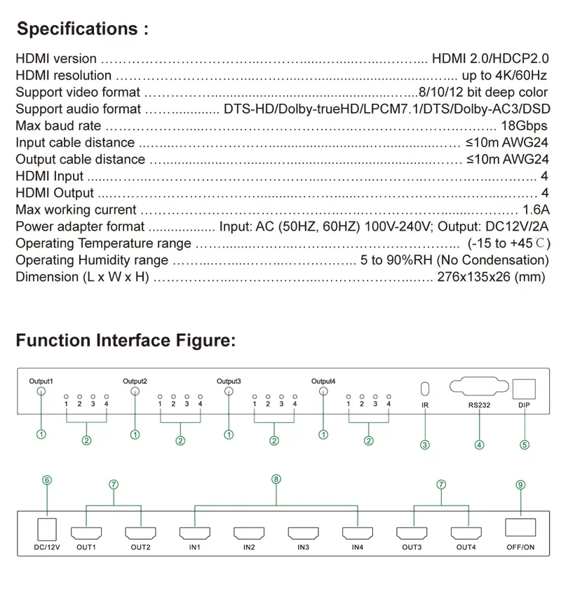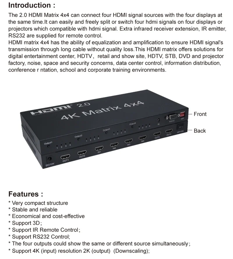 Esta matriz HDMI es una matriz verdadera HDMI 4 por 4.Permite cualquier fuente de vídeo HDMI