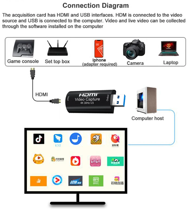 Features: Support input resolution up to 4K@30Hz; * Support output resolution up to 1080P@60Hz; * Support 24/30/36bit deep color; * Support AWG26 HDMI standard cable: input up to 15 meters, (1080P and below resolution); * Support most acquisition software, such as VLC,OBS ,Amcap,Vmix,Wirecast,Potplayer, etc; * Support Windows,Android and MacOS; * Conform to USB Video and UVC standard; * Conform to USB Audio UAC standard; * Without external power supply, compact and portable * Operating Temperature range : -10 to +55℃ * Size: mini portable sizeComputer hardware configuration requirements CPU: PC i5-3400 or above ;NB i7-3537U 2.0GHZ or above Graphics card: PC NVIDIA GT630 or above;NC NVIDIA GT735M or above Run memory: 4G RAM