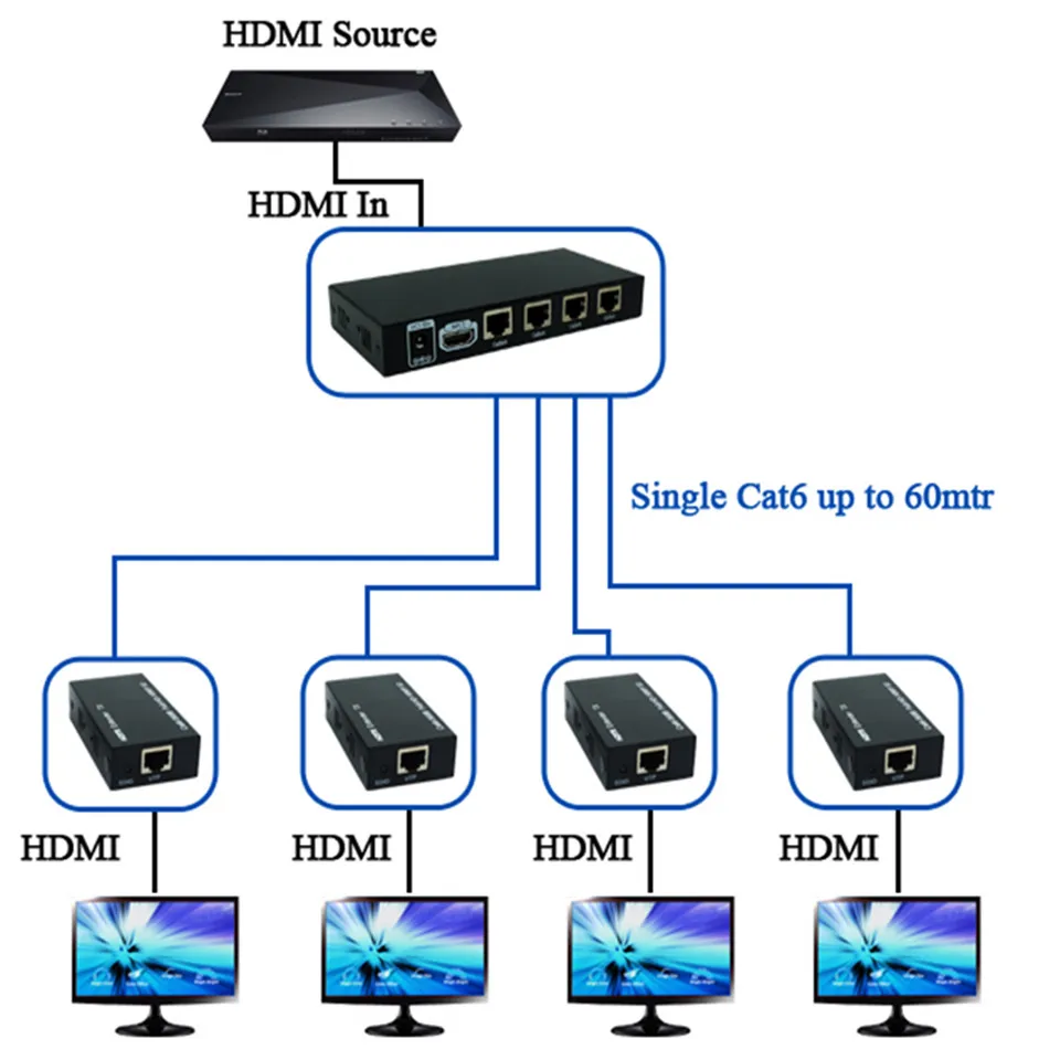 HTS0104: distancia de 60 M, 1080 @ 60 Hz, sincronización de audio, soporte POE EDID,1TX y 4RX,no necesita un interruptor