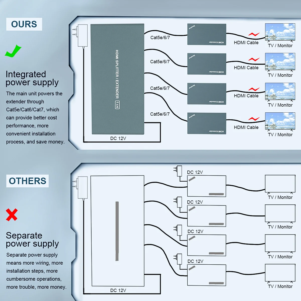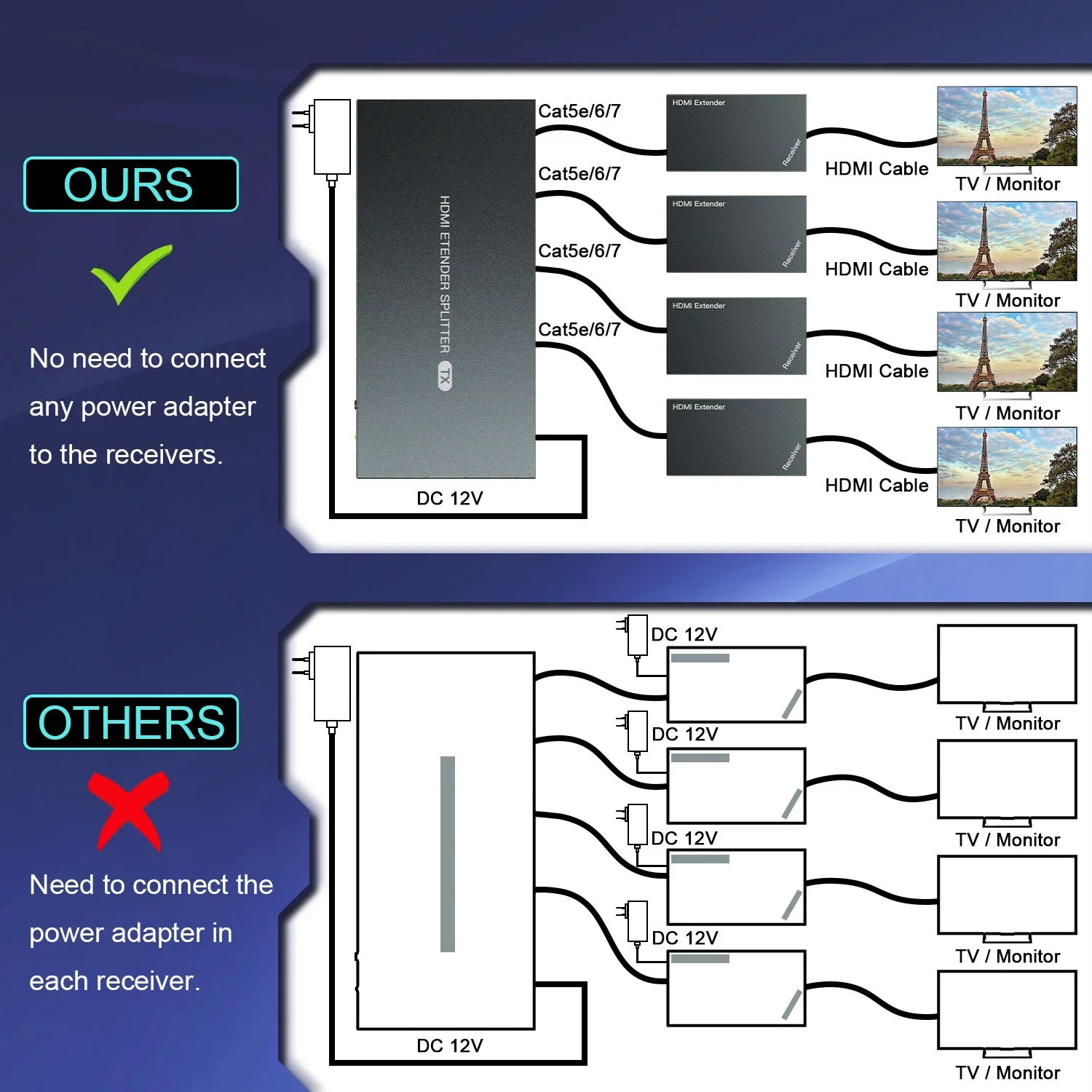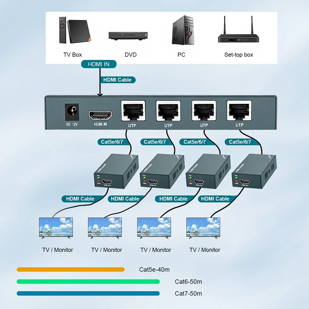 1. Conecte las fuentes de alimentación DC12V proporcionadas a la toma de corriente del transmisor y alreceptor,2. Conecte el cable HDMI entre el puerto de entrada HDMI del transmisor y el puerto de salida HDMI.de la fuente de vídeo,3. Conecte el puerto de salida HDMI del receptor al dispositivo de visualización con un cable HDMI.4. Conecte el puerto RJ45 del transmisor al puerto RJ45 del receptor mediante un único cable CAT6.