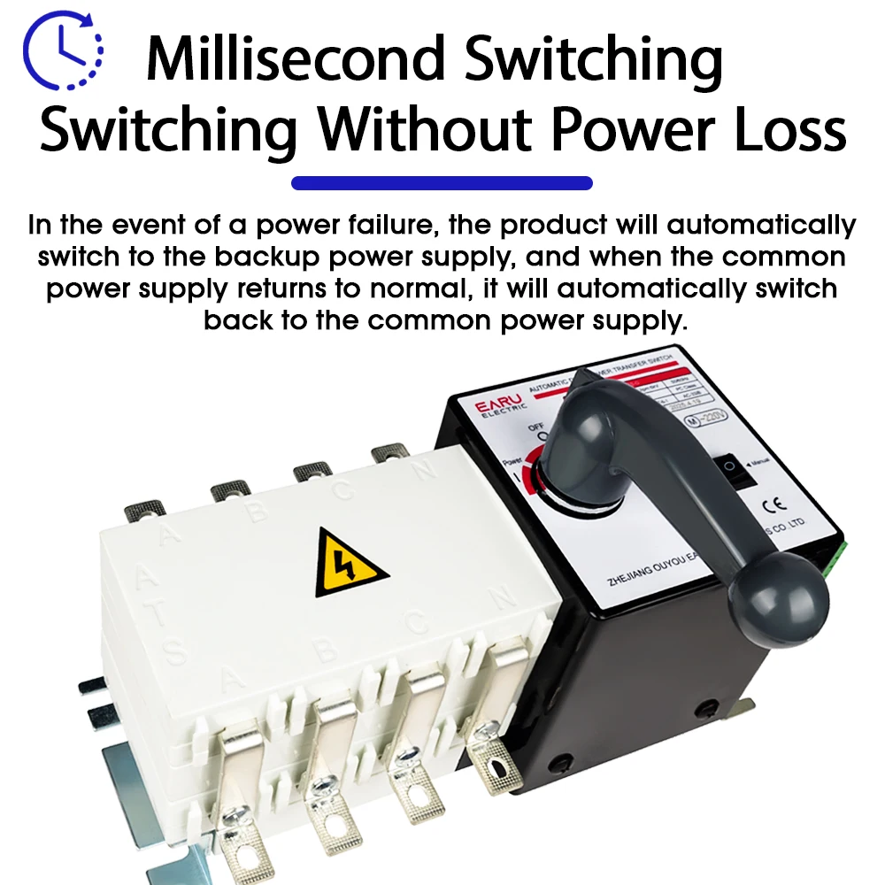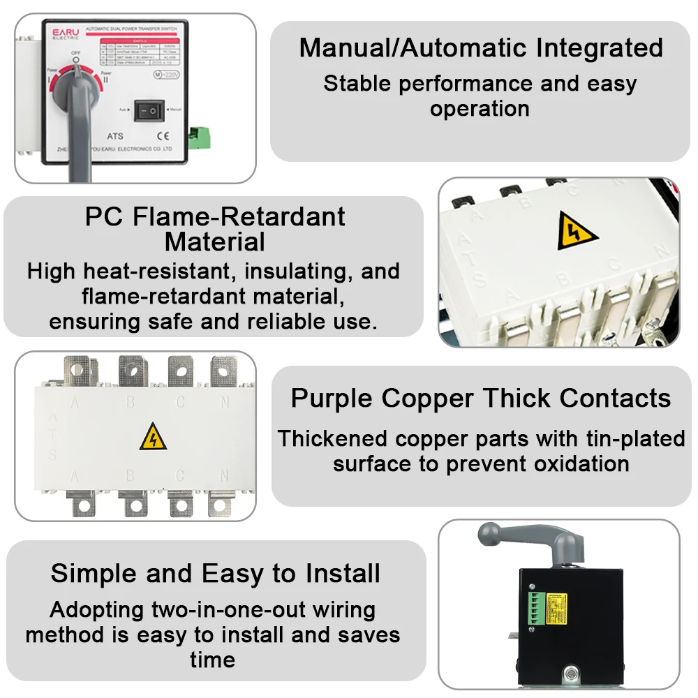 Interruptor de transferencia automática de doble potencia (A.T.S), es un conjunto de conmutación y control lógico en uno, sin necesidad de controladores adicionales, la real realización de la integración mecánica y eléctrica del interruptor de transferencia automática, con detección de voltaje, detección de frecuencia, enclavamiento eléctrico, mecánico y otras funciones. Se puede realizar automáticamente, control remoto eléctrico, manual de emergencia..