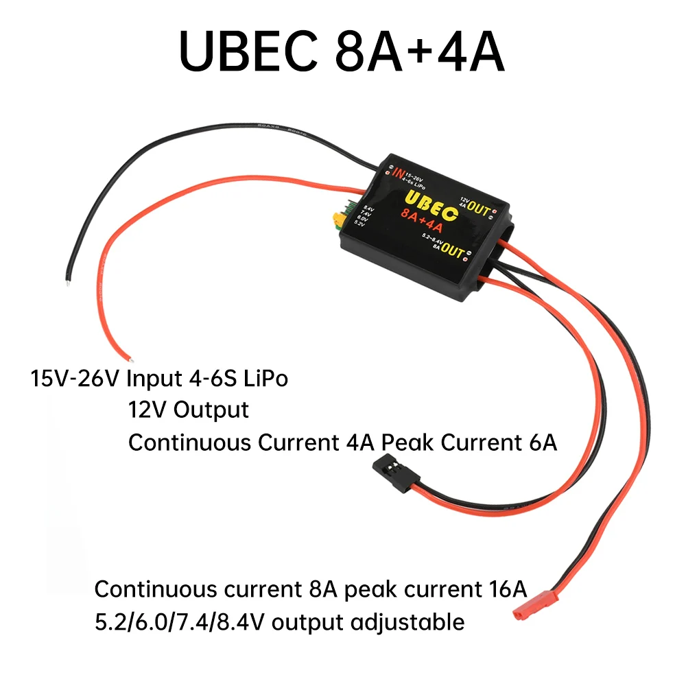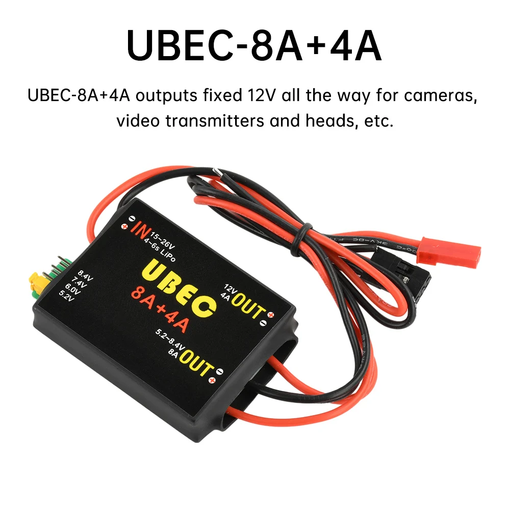 4.UBEC-8A+4A produce un voltaje fijo de 12 V en todo momento, que se puede utilizar para cámaras, transmisores de vídeo y equipos de cardán.