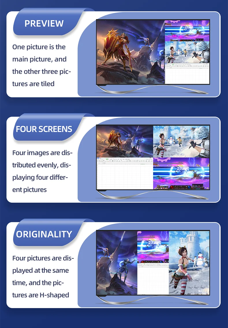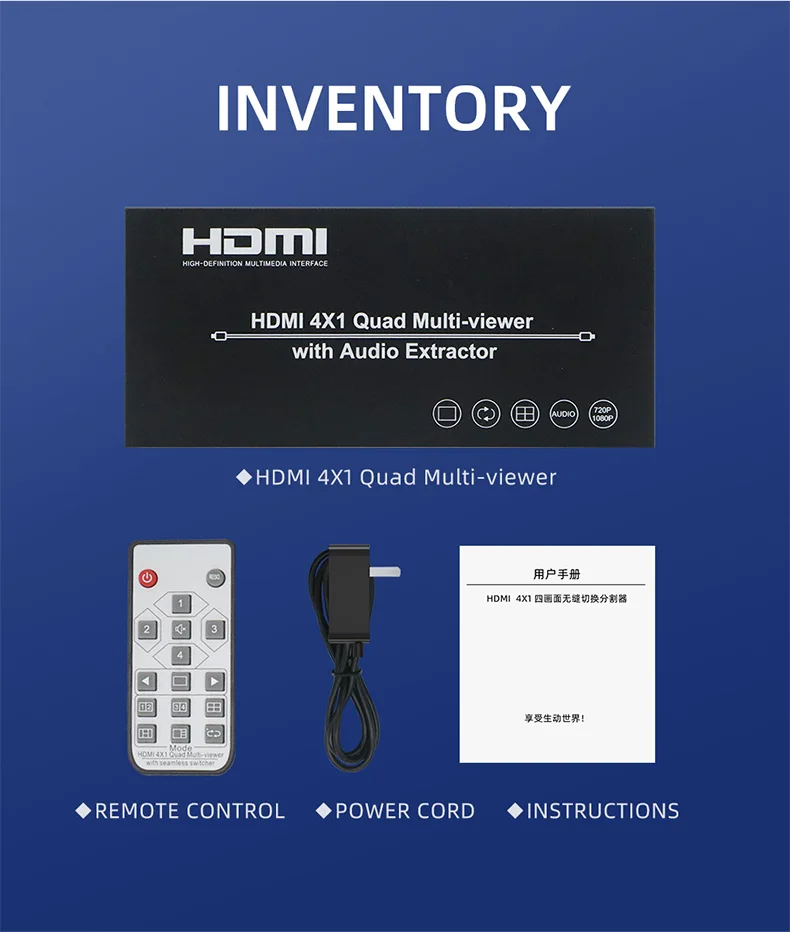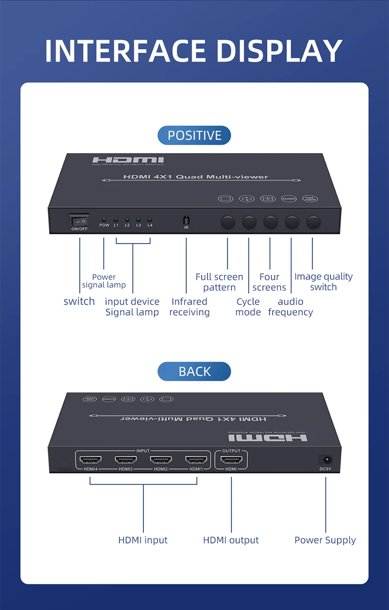 Este producto es un alto rendimiento 4 por 1 HDMI Quad Multi-Viewer. El multivisor HDMI admite cuatro pantallas de fuente de entrada de alta definición en una pantalla y tiene varios modos de visualización multivista.