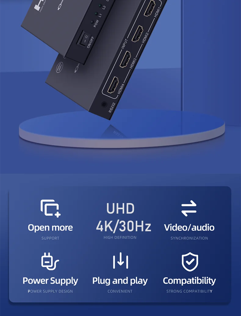 Como conmutador, también puede cambiar las cuatro entradas HD libremente. El producto se puede controlar de varias maneras, a través del control de botones del panel frontal, control IR.