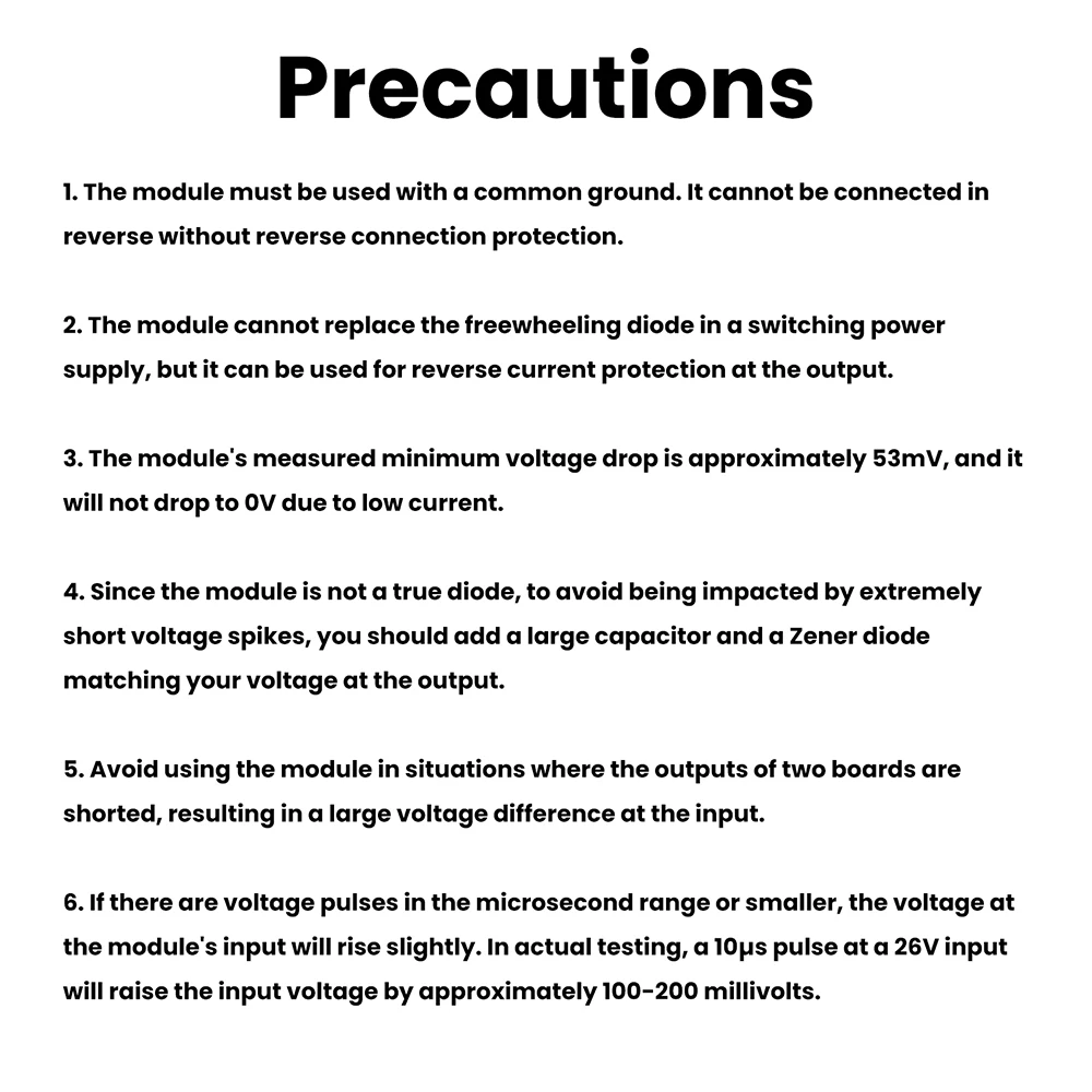1.El módulo debe usarse en el mismo terreno y no se puede invertir sin protección inversa. 2.El módulo no puede reemplazar el diodo de rueda libre en la fuente de alimentación conmutada, pero puede usarse como antirreflujo en el extremo de salida. 3.La caída de voltaje mínima medida del módulo es de aproximadamente 53 mv y no caerá a 0 debido a la baja corriente. 4.Como el módulo no es un diodo real, para evitar el impacto de pulsos de pico extremadamente cortos, debe agregar un condensador grande y un diodo regulador de voltaje que coincida con su voltaje en el terminal de salida. 5.Evite usarlo en situaciones en las que la diferencia de voltaje de entrada es demasiado grande cuando dos placas están en cortocircuito. Si hay pulsos de voltaje de nuestro nivel o más pequeños en el voltaje, el voltaje en el terminal de entrada del módulo experimentará un ligero aumento.En las pruebas reales, un pulso de 10us de entrada de 26 V hará que el voltaje del terminal de entrada aumente aproximadamente una o doscientos milivoltios.