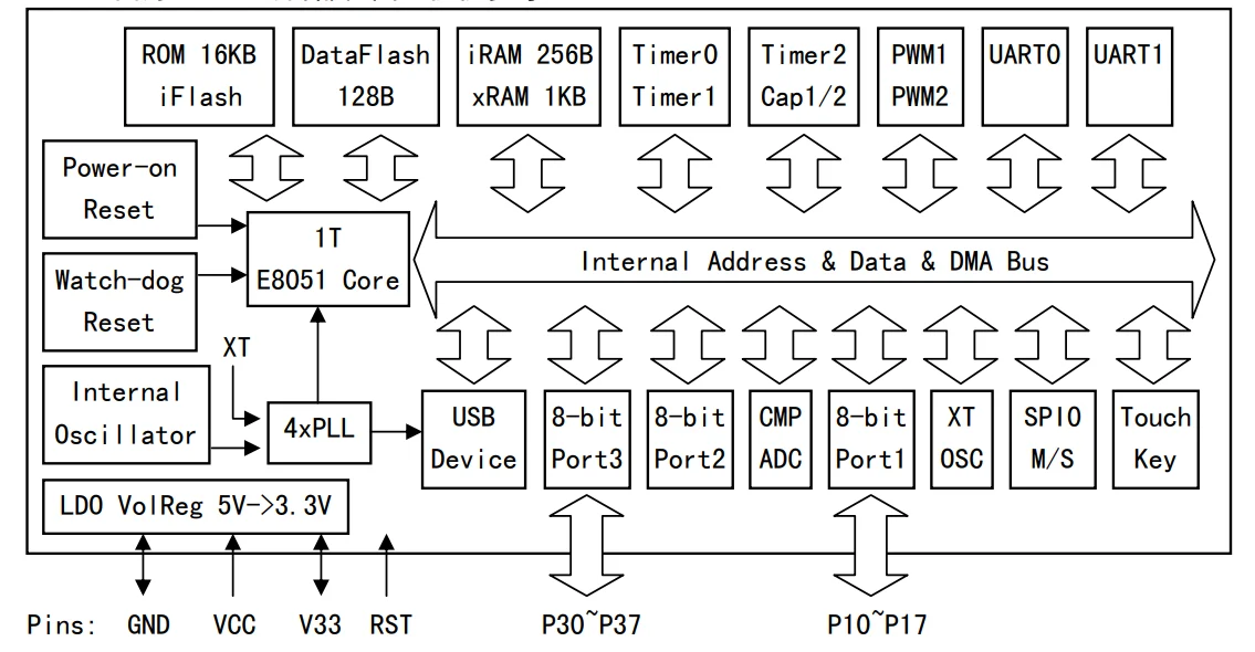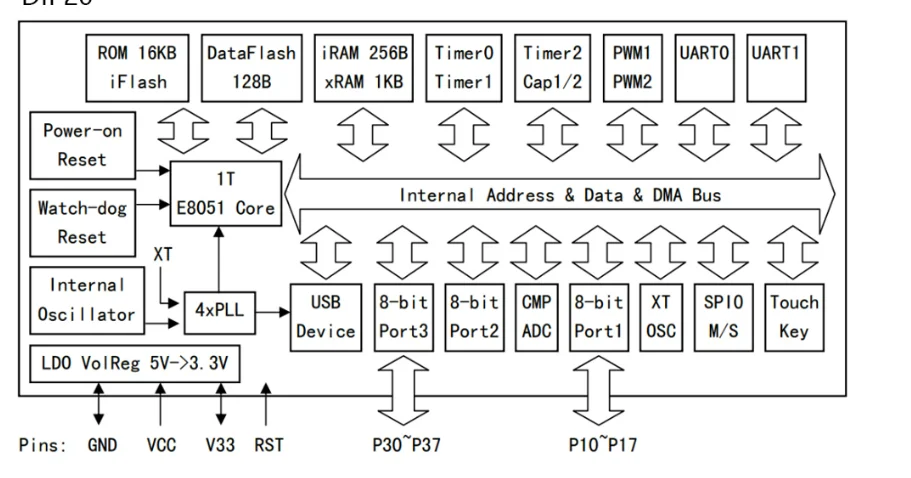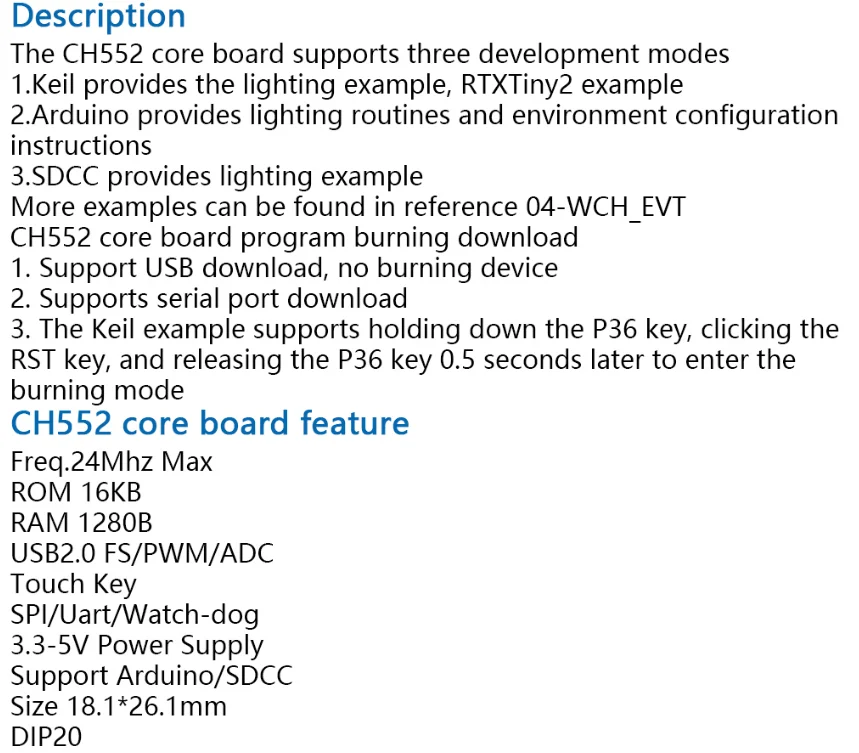 CH552 supports up to 24MHz system frequency, built-in 16K program ROM and 256 bytes of internal iRAM and 1K bytes of in-chip xRAM, xRAM supports DMA direct memory access.