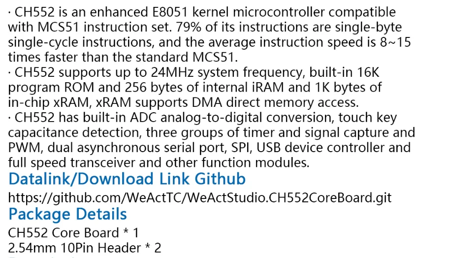 CH552 is an enhanced E8051 kernel microcontroller compatible with MCS51 instruction set. 79% of its instructions are single-byte single-cycle instructions, and the average instruction speed is 8 ~ 15 times faster than the standard MCS51.