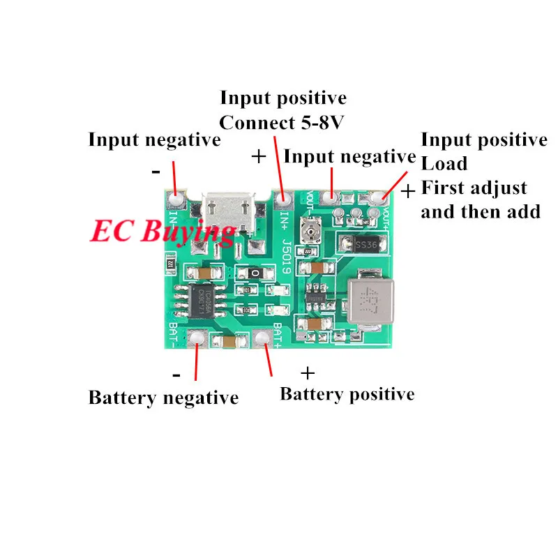 Por ejemplo, el terminal BAT+ del panel solar de terminación VIN+ de 5 V puede generar 4,2 V para cargar la batería de 3,7 V 18650. El terminal OUT+ puede generar un voltaje ajustable.