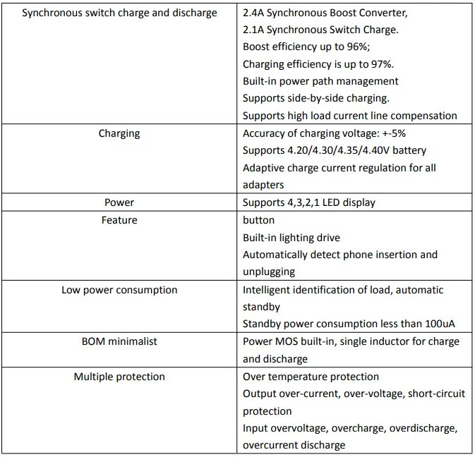 El IP5306 es un SOC de administración de energía multifunción con un convertidor de refuerzo integrado, administración de carga de batería de litio e indicación de energía de la batería, que proporciona una solución de energía completa para energía móvil.El alto nivel de integración y versatilidad del IP5306 permiten utilizar sólo unos pocos componentes externos en la aplicación y reducir el tamaño de la solución general.El IP5306 requiere solo un inductor para las funciones buck and boost.El convertidor DC-DC funciona a 500 KHzEl sistema de refuerzo síncrono del IP5306 proporciona hasta 2,4 A de corriente de salida con una eficiencia de conversión de hasta el 91%.Cuando está descargado, suena automáticamente y la corriente de reposo cae a 50uA.