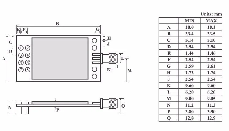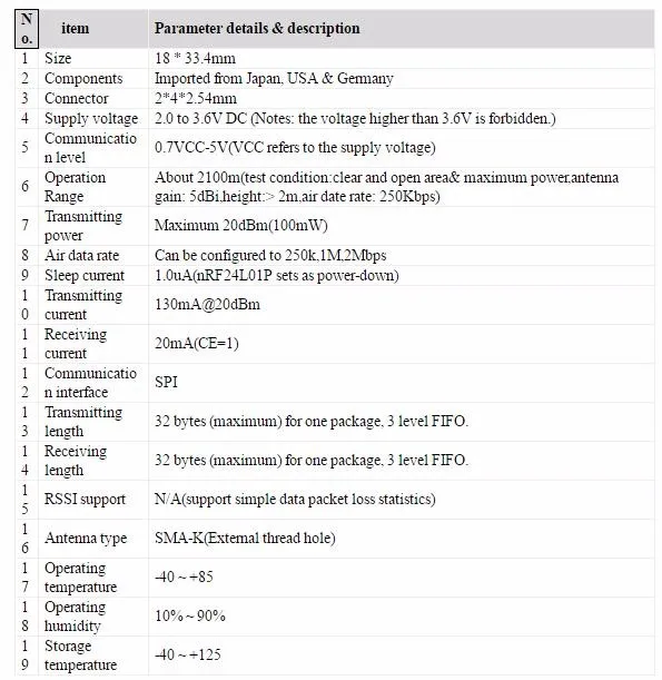 Model: E01-ML01DP5Interface: SPIPower: 20dBmDistance: 2100mRF connector: SMA-KFrequency: 2.4GHz(2400MHz-2525MHz)Feature: E01-ML01DP5 is based on original imported nRF24L01P form Nordic in Norway. And equipped with 20dBm power amplifier chip imported from USA, which makes the transmitting power achieves 100mW (20dBm) while the receiving sensitivity enhanced by 10dB. Those features make the transmitting distance 10 times longer than nRF24L01P itself. The anti-interference shielding cover on the module makes the anti-interference performance better.Product Parameters: