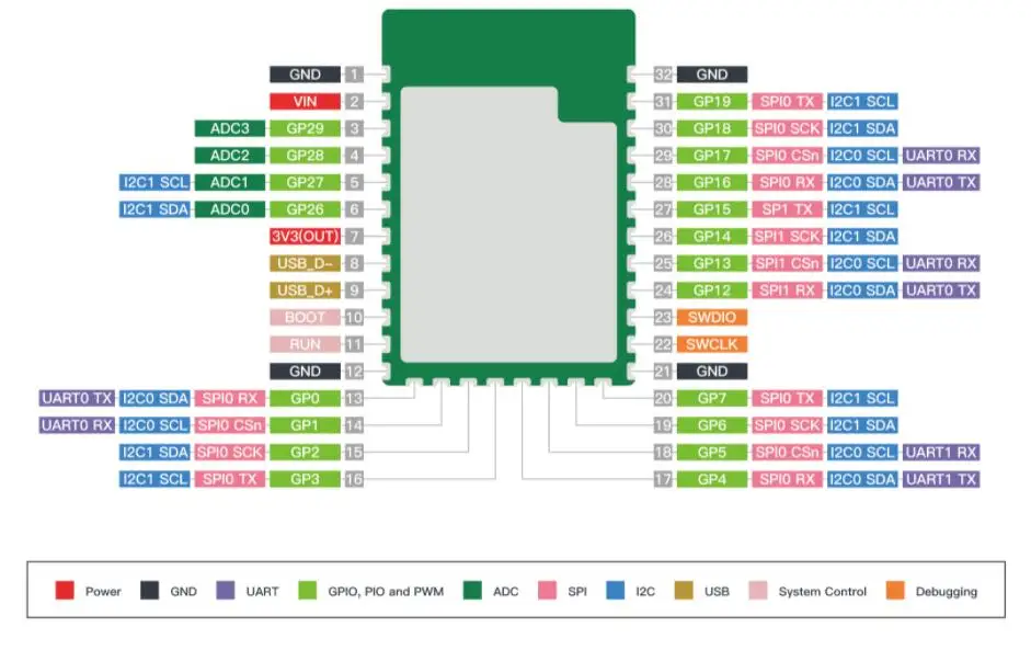 Además de la combinación de chips wifi RP2040 + ESP8285, la placa tiene interfaces ricas, que incluyen 32 pines GPIO (20 pines compatibles con PIO y PWM), 2 UART, 4 ADC, 2 SPI, 2 I2C.Algunos pines se pueden multiplexar, como GP12 y GP13 con funciones I2C,SPI,UART.Es por eso que 28 PIN GPIO pueden lograr más PIN e interfaces de E/S.El módulo Wio RP2040 también tiene un PIN USB, que se puede diseñar y conectar a la interfaz USB.