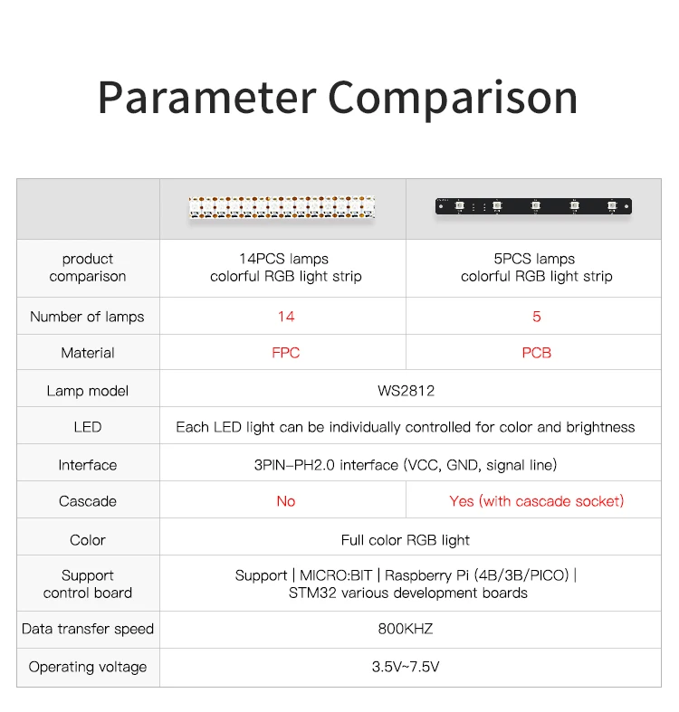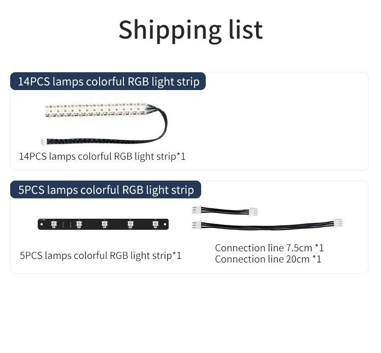 Hay dos tipos de tiras de luz, utilizan lámparas tipo WS2812, el voltaje de funcionamiento es de 3,5 V ~ 7,5 V.