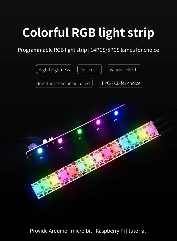 Está hecho de material FPC, suave y flexible.Con 14 luces RGB programables de alto brillo, que utilizan la interfaz PH2.0-3PIN, los usuarios pueden configurar una variedad de colores diferentes.Compatible con Arduino/Micro:bit/Raspberry Pi y otros controladores, se puede utilizar para decorar robots y crear algunos trabajos de bricolaje.