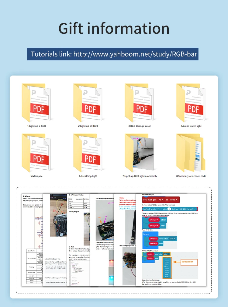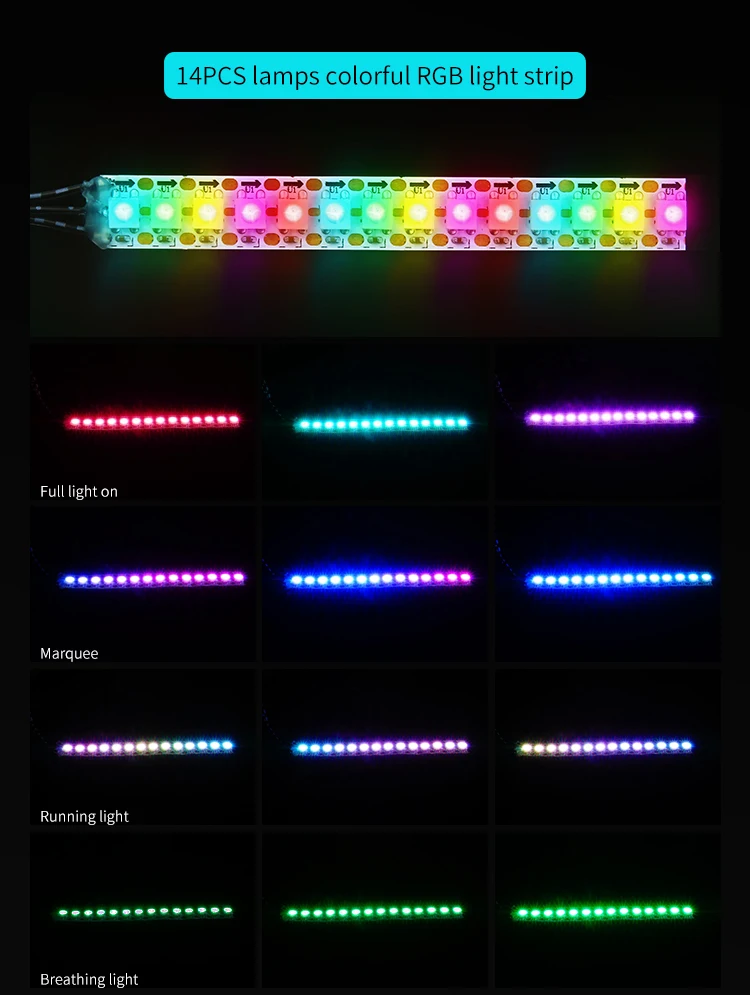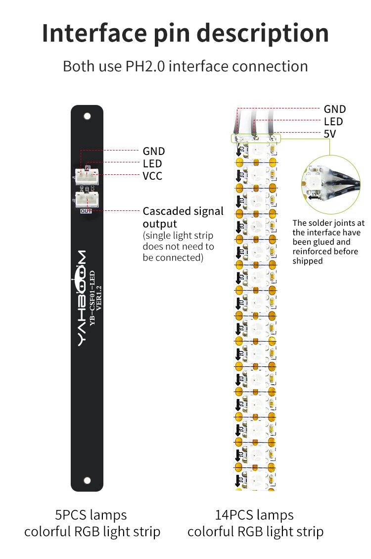 Está hecho de material PCB, resistente y duradero.Con 5 luces RGB programables de alto brillo, 1 interfaz de entrada (PH2.0-3PIN)