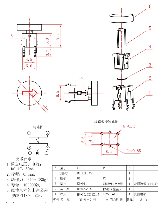 5 uds 6*6*9,5mm 6PIN DIP agujero pasante Micro pulsador táctil momentáneo con interruptor LED modo de botón de indicación táctil