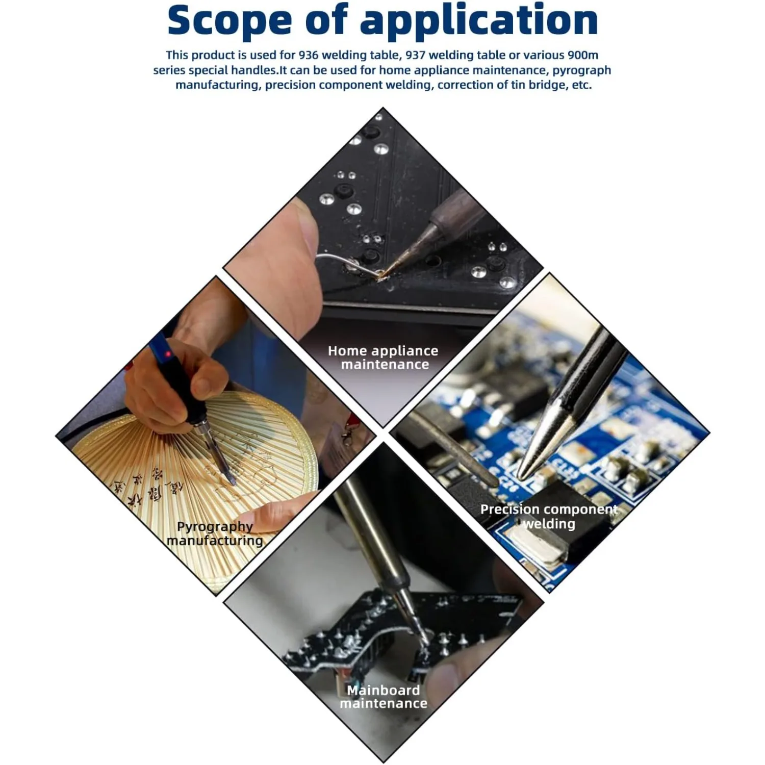 La punta de la aguja del soldador se puede aplicar en diversas ocasiones, como soldadura de componentes electrónicos, mantenimiento de fábrica, reparación de electrodomésticos, mantenimiento de la placa principal del circuito, etc.
