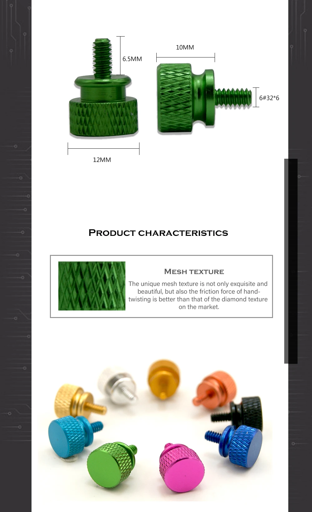 Tamaño: UNC6# -32 (M3,5) * 6,5 mmDiámetro de la rosca: 6#=3,51 mm paso 32Material: aleación de aluminioLista de envío: 5 piezasCon el uso del proceso de ánodo de galvanoplastia, puede desmontarlo manualmente y diseño sin herramientas.Características: revestimiento brillante, sensación de bienestar, textura, ultraligero. Puede basarse en sus preferencias o en el color del chasis.
