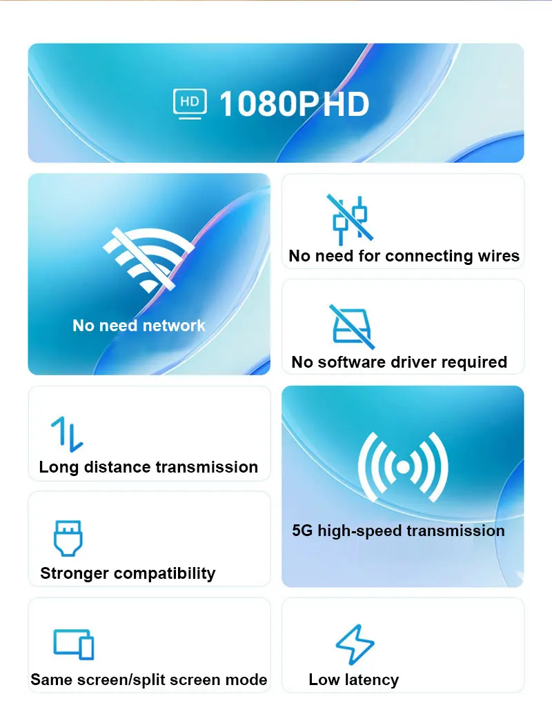 El transmisor inalámbrico HDMI transmite señales de audio y video de alta definición a través de WiFi 5G, y los vídeos de alta definición desde PC o dispositivos móviles completamente funcionales se transmiten a través de WiFi, lo que permite aplicaciones uno a uno.El dispositivo tiene excelentes capacidades de transmisión y procesamiento de imágenes, lo que hace que la transmisión de la señal sea más fluida y estable.