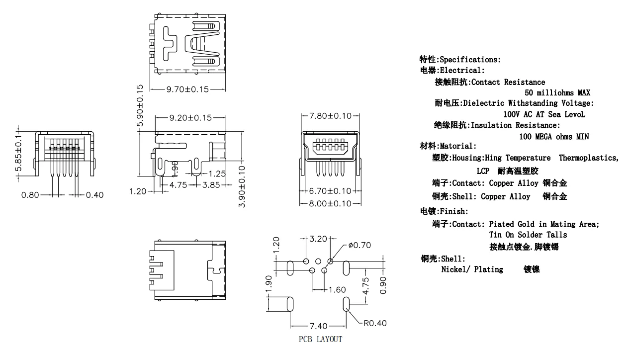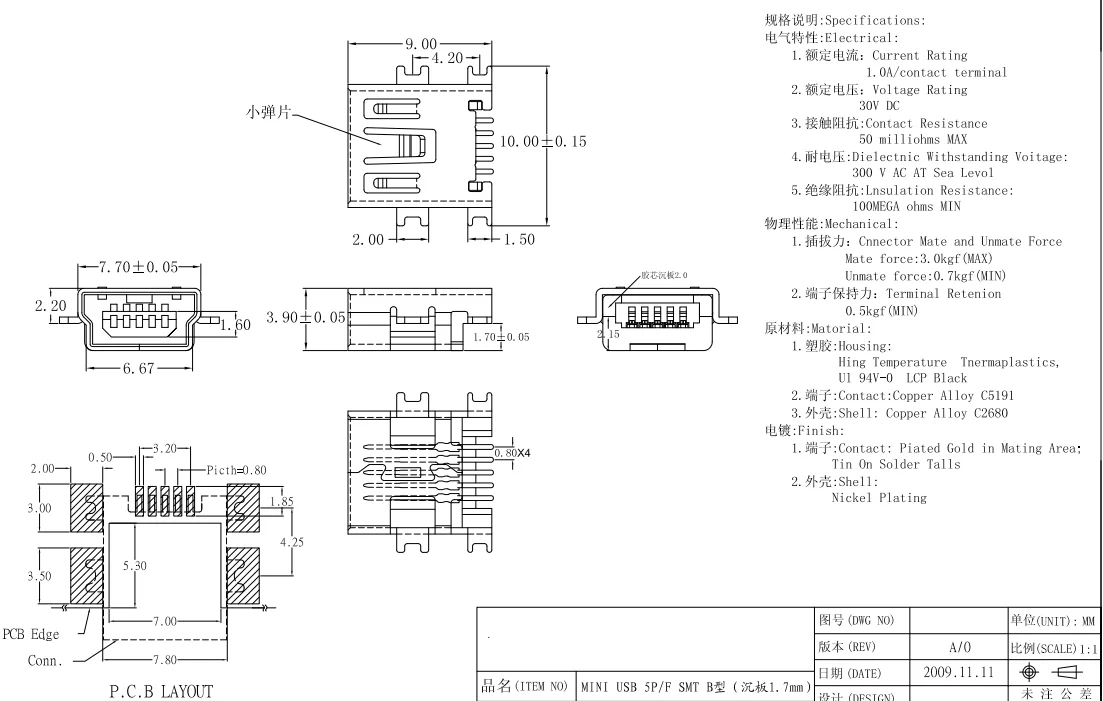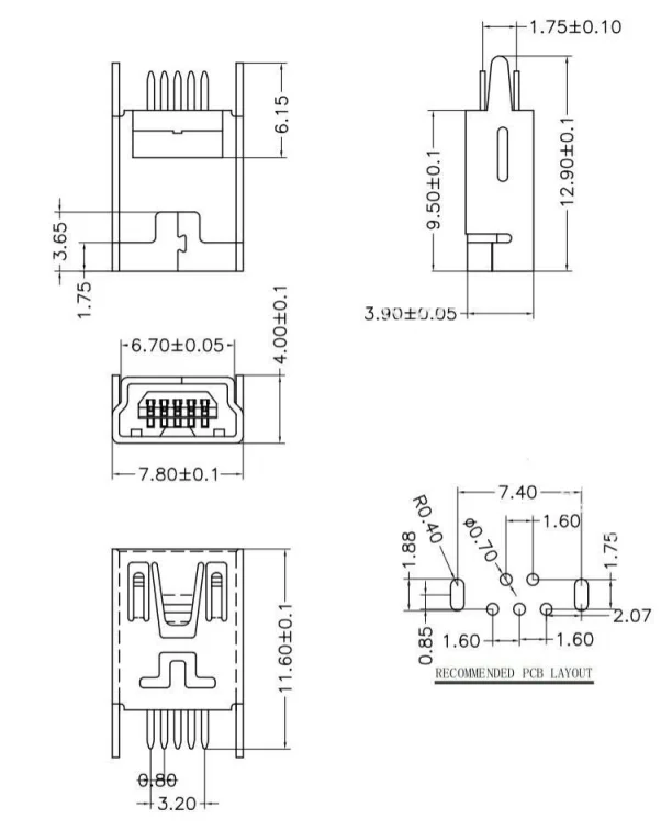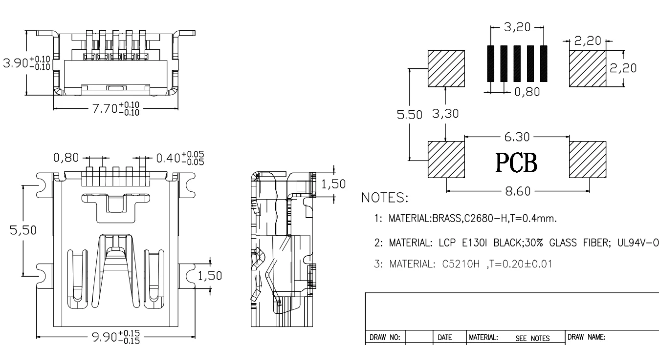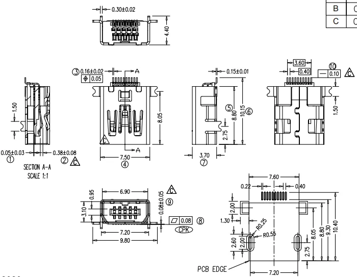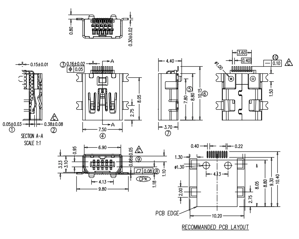 MiNi USB 10P/Hembra Inserto frontal Trasero SMD
