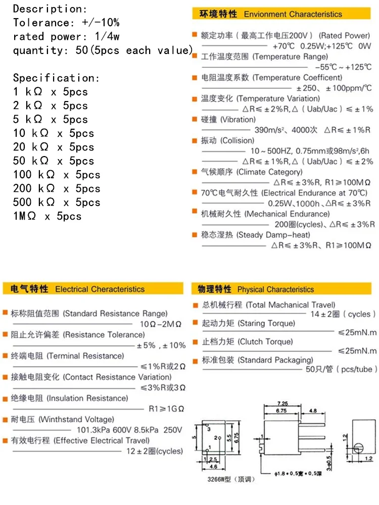 50 Uds 3266W serie 1K 2K 5K 10K 20K 50K 100K 200K 500K 1M potenciómetro multivuelta resistencias variables juego surtido