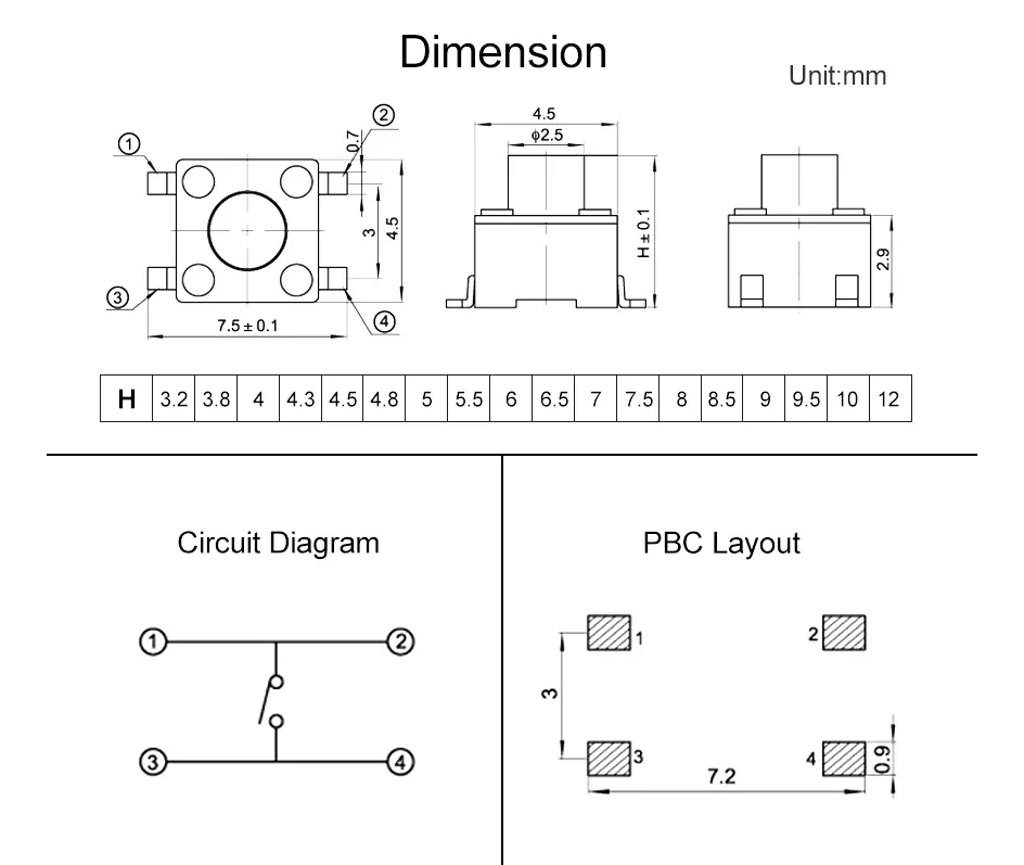 50 Uds 4.5*4.5*4/5/6/7/8/9/10/12mm interruptor táctil momentáneo botón de encendido y apagado 4 pines SMD SMT Microinterruptor conjunto electrónico