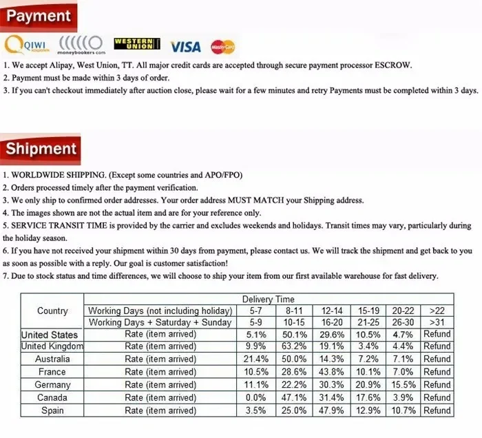 Sobre el pago 1. Los pedidos se procesan oportunamente después de la verificación del pago.2.El pago completo debe realizarse dentro de los 7 días posteriores a la realización de su pedido, de lo contrario el pedido no será válido o el sistema lo cancelará.3.Asegúrese de haber completado toda la información detallada como persona de contacto, dirección, código postal y número de teléfono al completar la información de su comprador.Envío y entrega 1. Correo de Singapur: entre 15 y 35 días en llegar, 2. Correo aéreo de China Post: alrededor de 15-90 días en llegar.3.DHL: alrededor de 5 a 15 días en llegar 4.EMS: alrededor de 7 a 15 días en llegar Acerca de los comentarios 1. La confirmación temprana del comprador será muy apreciada después de recibir los artículos.2. Dado que sus comentarios son muy importantes para el desarrollo de nuestro negocio, lo invitamos sinceramente a dejarnos comentarios positivos si está satisfecho con nuestro producto y servicio.Sólo le llevará 1 minuto, pero este minuto tiene un significado extremadamente vital para nosotros.3. Contáctanos antes de dejar un comentario negativo o neutral.Trabajaremos con usted para resolver cualquier problema. Sobre el pago