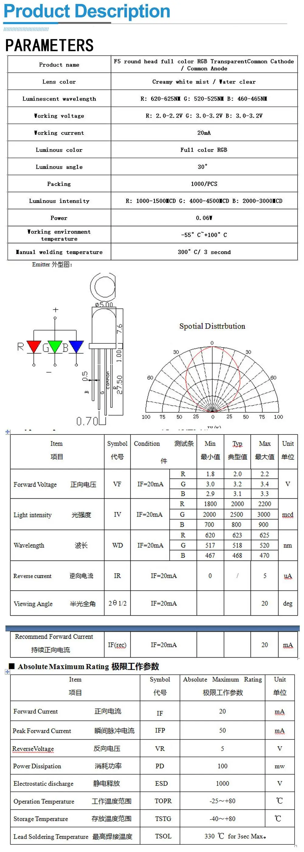 50 piezas de LEDs RGB de 5 mm opacos (difundidos) con ánodo común, recibidos rápidamente y en buenas condiciones. Funcionan a la perfección. Los voltajes de diodo medidos con mi multímetro ANENG AN8008 son: Rojo: Vf = 1.76 V --------- Verde: Vf = 2.24 V --------- Azul: Vf = 2.48 V. Estos datos son útiles para calcular resistencias a fin de obtener el brillo deseado para cada color base (RGB). Estoy muy satisfecho con estos diodos. Recomiendo.