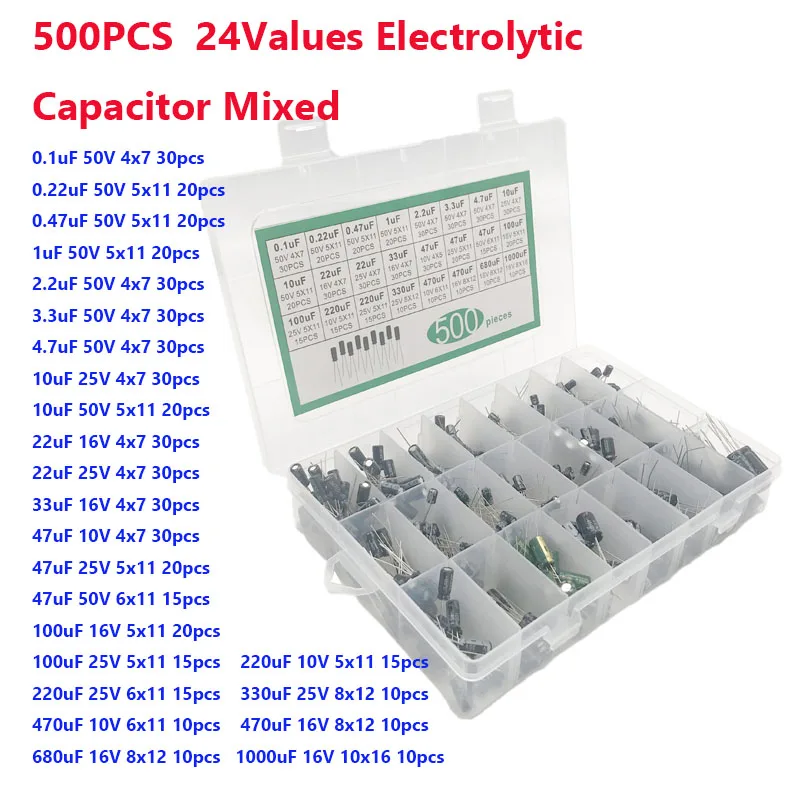 500 Uds 24 valores condensador electrolítico mezclado SMD condensadores electrolíticos 10V 16V 25V 50V 0.1uF-1000uF Kit electrónico para Arduino
