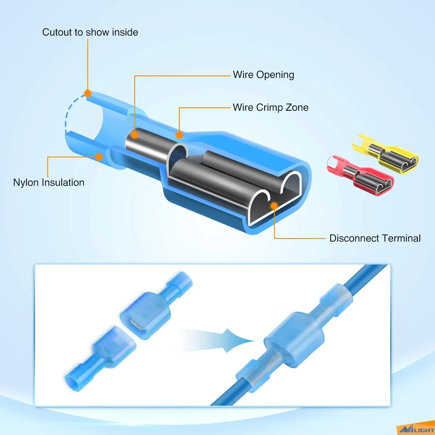 El paquete incluye: kit de terminales de engarzado macho y hembra de 500 piezas. Incluye 250 terminales macho y 250 hembra. 100 piezas cada una para cables de calibre 22-18 y 16-14. 50 unidades cada una para cables de calibre de 12 a 10.