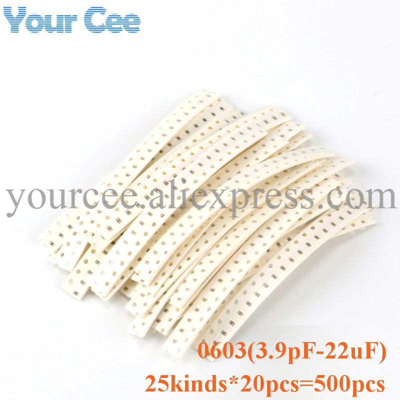 Comprar 500pcs 0603 3.9pF-22uF SMD Capacitor Assorted Sample Kit Electronic Components Diy 25 Values*20pcs=500pcs