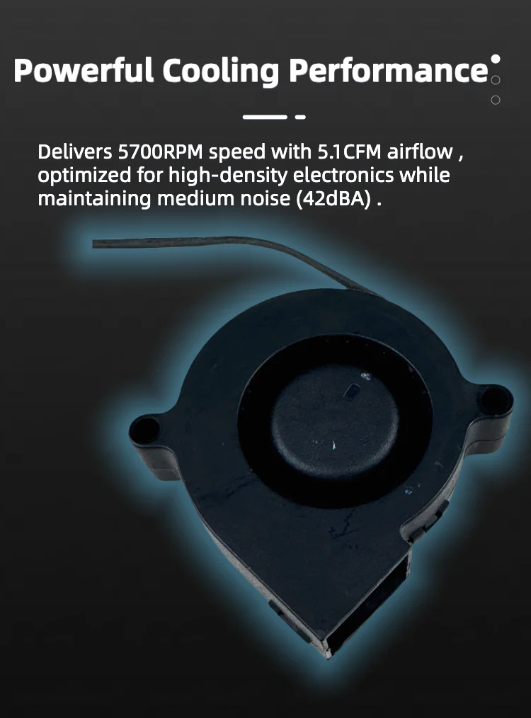 Soplador compacto de alto rendimiento: Con su tamaño compacto de 50x50x15 mm y una potente velocidad de 5700 RPM, este ventilador está diseñado para ofrecer un flujo de aire concentrado y una disipación efectiva del calor en espacios reducidos.Es ideal para el enfriamiento específico de componentes como disipadores de calor.