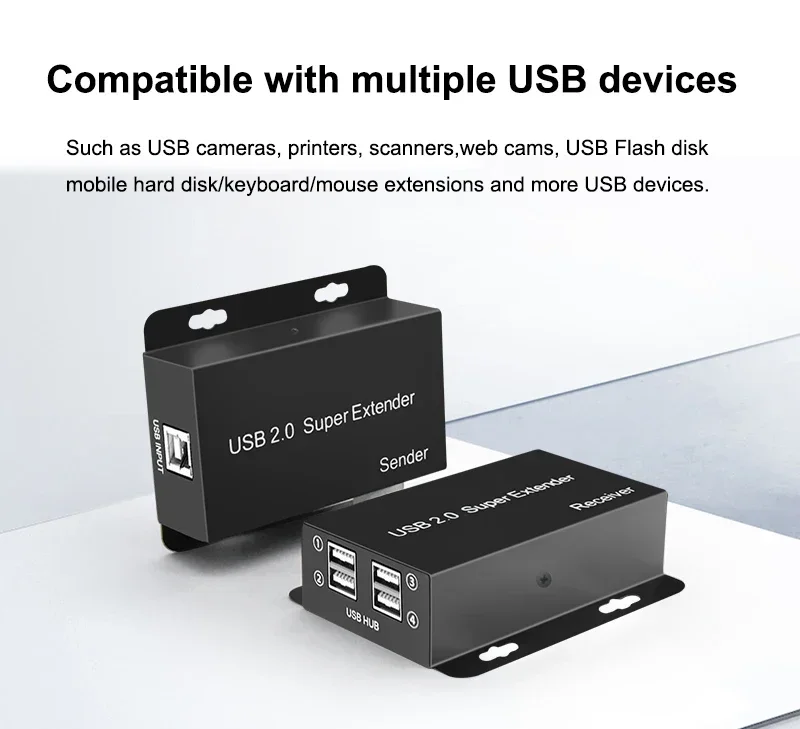 Este extensor USB extiende la señal conectada hasta 50m por cable Ethernet CAT5e/6/7. Con 4 puertos USB2.0, este también es un concentrador USB mientras conecta señales de larga distancia. Admite hasta 480Mbps, equipo de transmisión USB 2,0 de fácil acceso. Compatible con múltiples sistemas operativos: Windows, Mac OS, Unix, Android, Linux, etc. Compatible con PC, cámara web, impresora, escáner, disco USB, teclado, ratón y más. Plug and play, no se necesita controlador adicional, se instalará automáticamente cuando se conecte.
