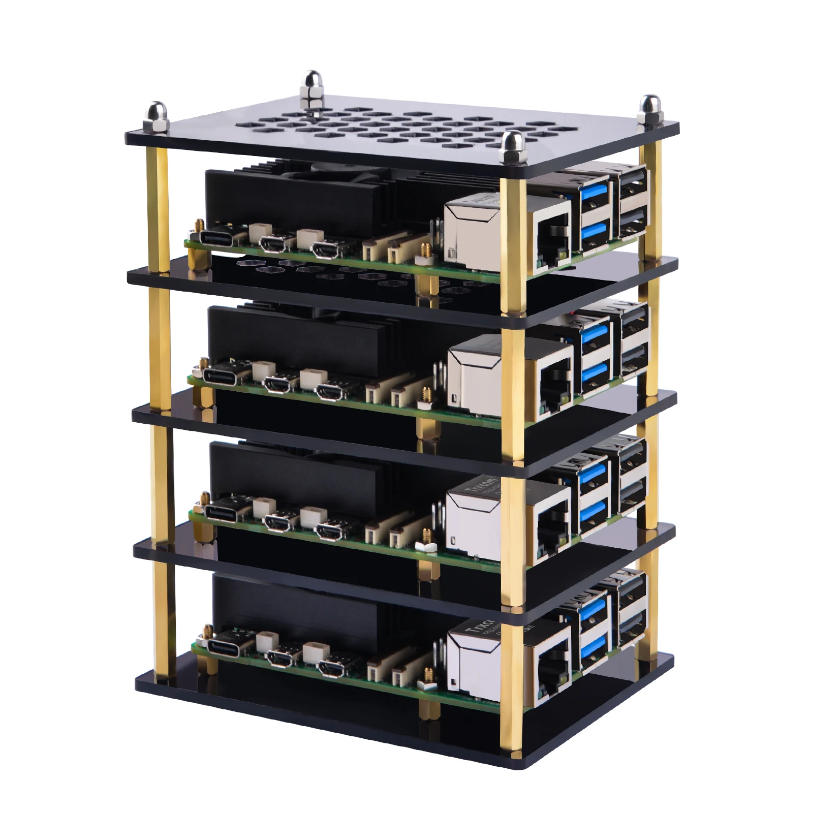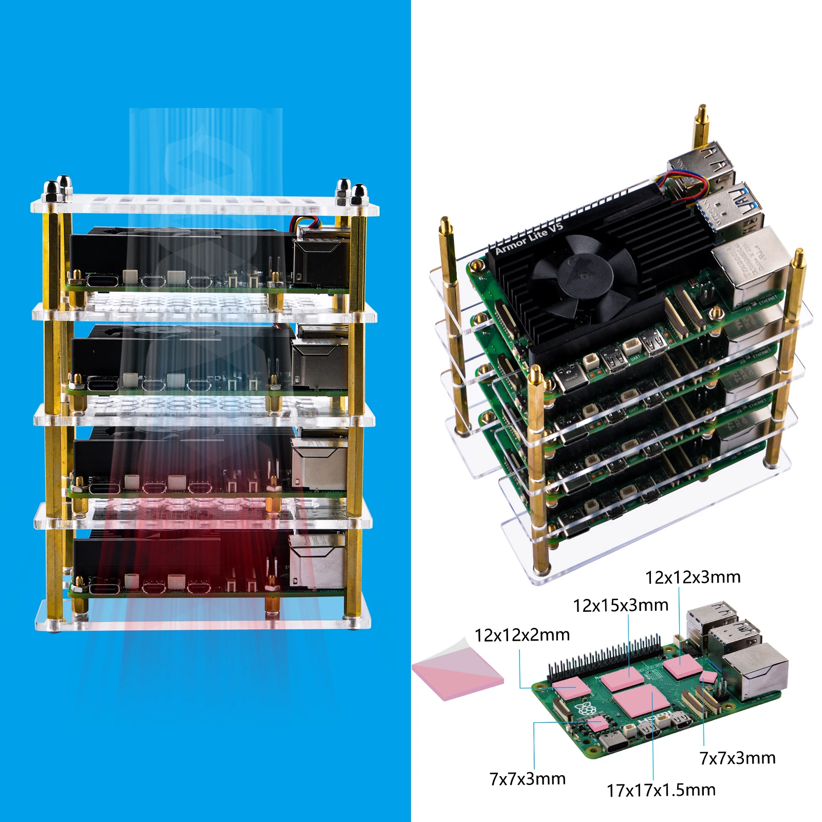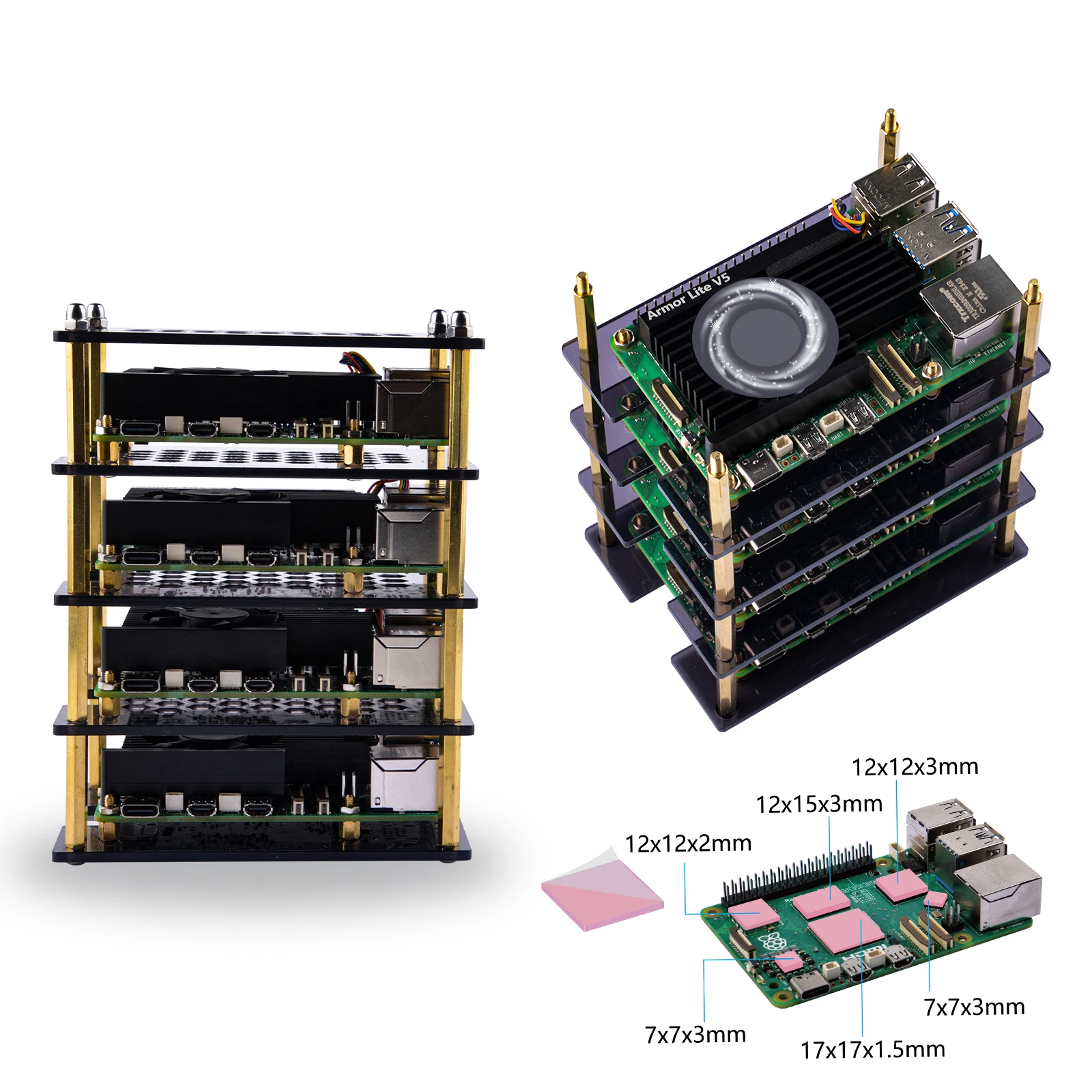 La carcasa acrílica de 4 capas, junto con 4 disipadores térmicos Armor Lite V5, está meticulosamente diseñada para Raspberry Pi 5. Elaborada con precisión, cada capa de acrílico se sujeta de forma segura mediante separadores de cobre, lo que garantiza la integridad estructural y la eficiencia térmica. Esta carcasa acrílica de cuatro capas está diseñada para acomodar cuatro unidades Raspberry Pi 5, lo que permite la creación de un pequeño grupo. Cada Raspberry Pi 5 puede funcionar de forma independiente y comunicarse entre sí a través de Internet o una red de área local, facilitando tareas de computación a mayor escala o aplicaciones distribuidas. La Configuración del clúster es sencilla de configurar y administrar, lo que lo hace adecuado para fines educativos, de desarrollo y experimentales. Con esta arquitectura de clúster, los usuarios pueden aprovechar el bajo coste, el bajo consumo de energía y la flexibilidad de Raspberry Pi 5 para crear entornos informáticos escalables y resistentes que satisfagan diversas necesidades informáticas.