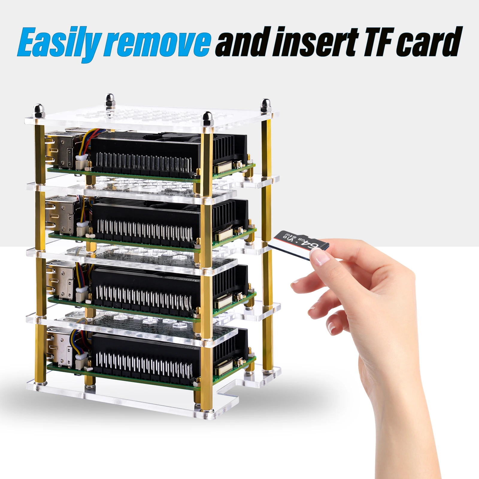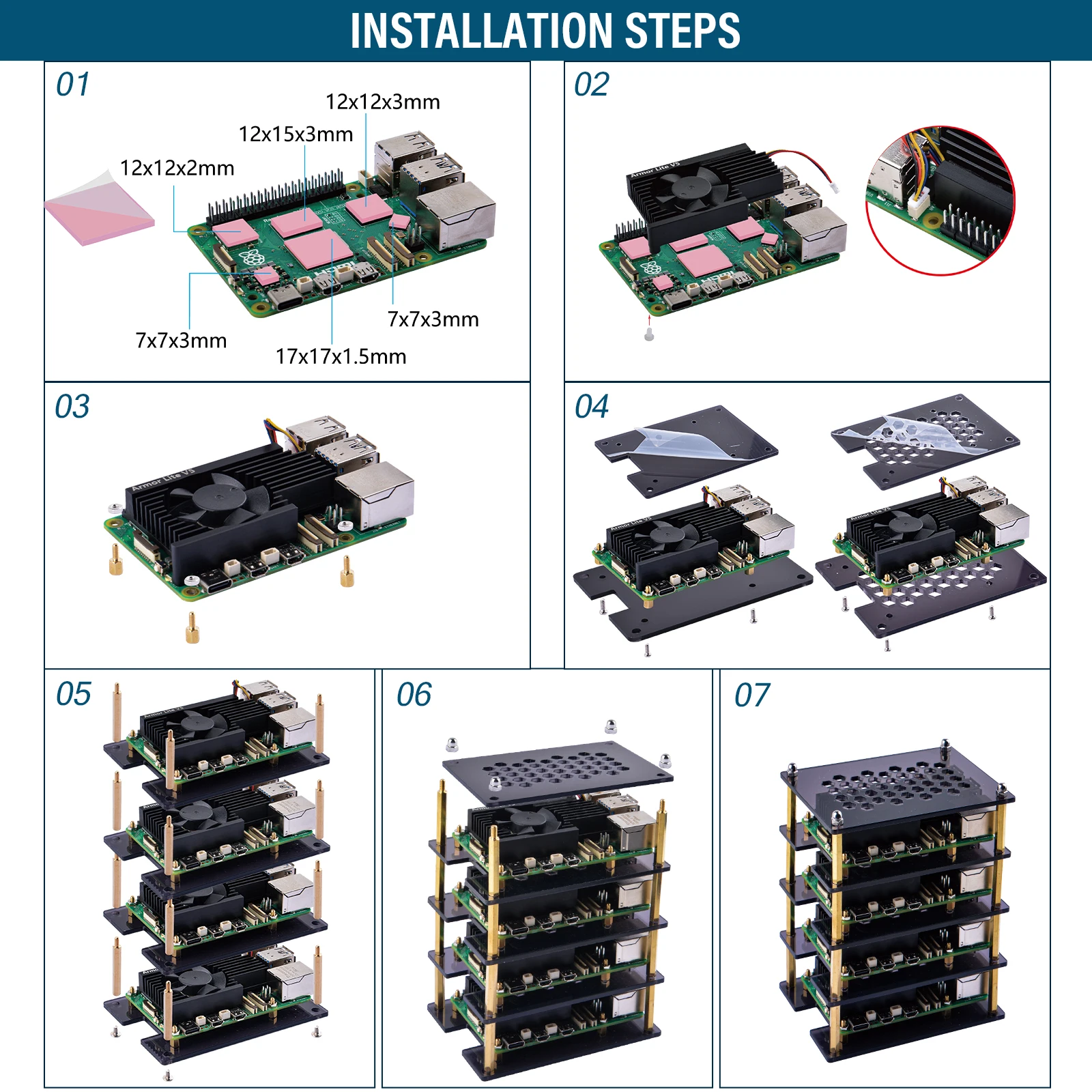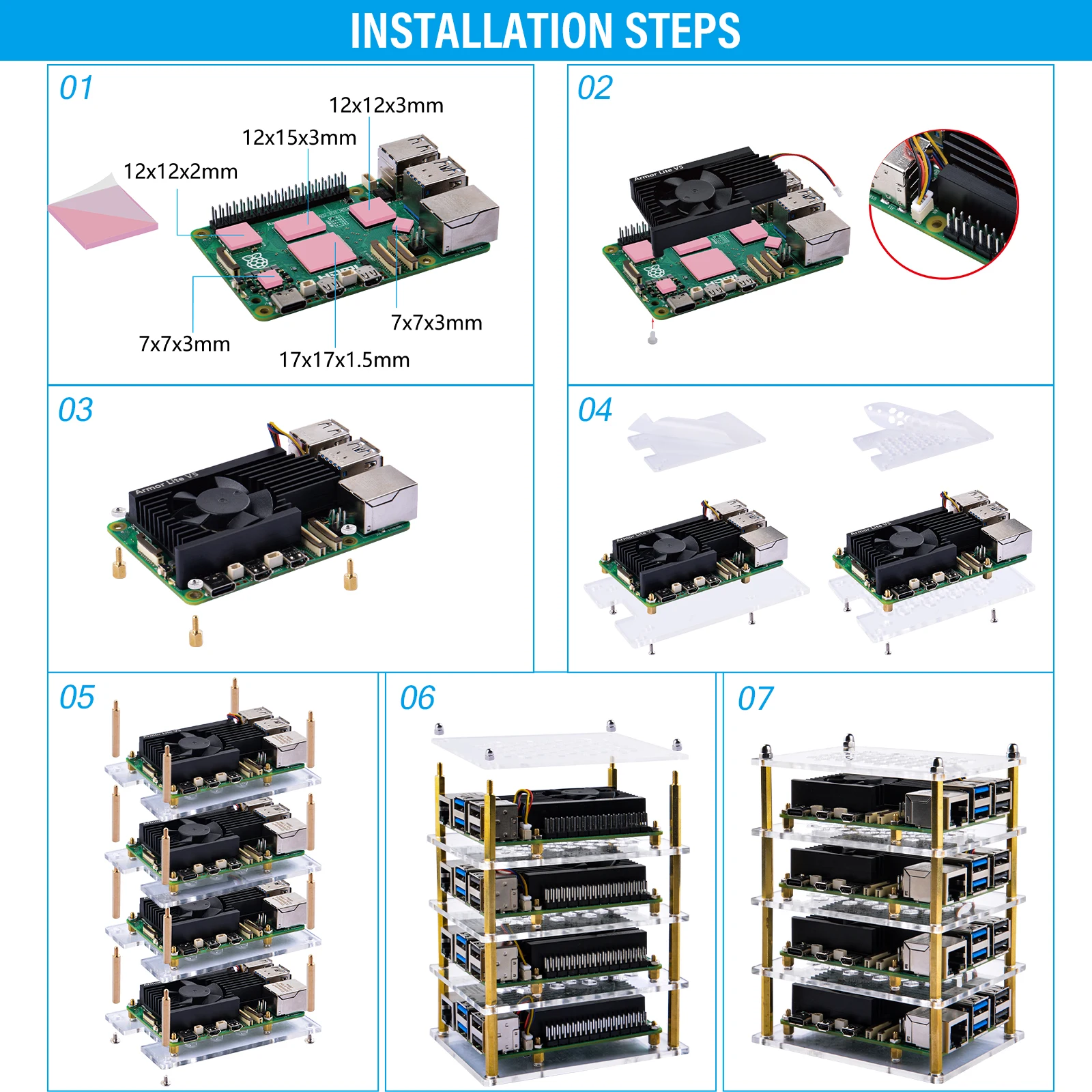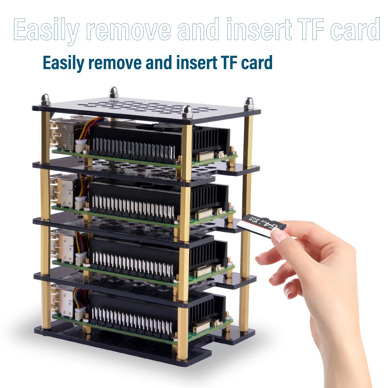 La carcasa acrílica de 4 capas, junto con 4 disipadores térmicos Armor Lite V5, está meticulosamente diseñada para Raspberry Pi 5. Elaborada con precisión, cada capa de acrílico se sujeta de forma segura mediante separadores de cobre, lo que garantiza la integridad estructural y la eficiencia térmica. Esta carcasa acrílica de cuatro capas está diseñada para acomodar cuatro unidades Raspberry Pi 5, lo que permite la creación de un pequeño grupo. Cada Raspberry Pi 5 puede funcionar de forma independiente y comunicarse entre sí a través de Internet o una red de área local, facilitando tareas de computación a mayor escala o aplicaciones distribuidas. La Configuración del clúster es sencilla de configurar y administrar, lo que lo hace adecuado para fines educativos, de desarrollo y experimentales. Con esta arquitectura de clúster, los usuarios pueden aprovechar el bajo coste, el bajo consumo de energía y la flexibilidad de Raspberry Pi 5 para crear entornos informáticos escalables y resistentes que satisfagan diversas necesidades informáticas.