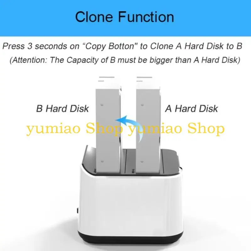 Función duplicadora de disco duro que le permite duplicar/clonar el disco duro existente sin el uso de un sistema informático host, o se puede conectar a un sistema informático para usarlo como base para disco duro externo.