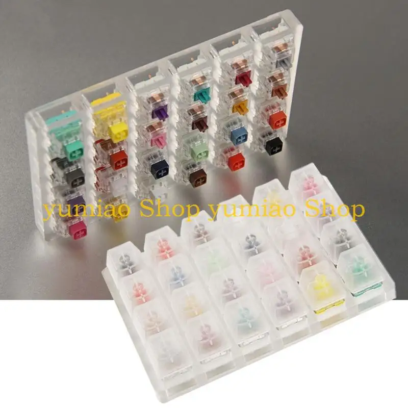 Montado en un modelo acrílico transparente, equipado con 24 teclas transparentes translúcidas de ABS, este probador de interruptores le permite conocer fácilmente el color de cada tecla.