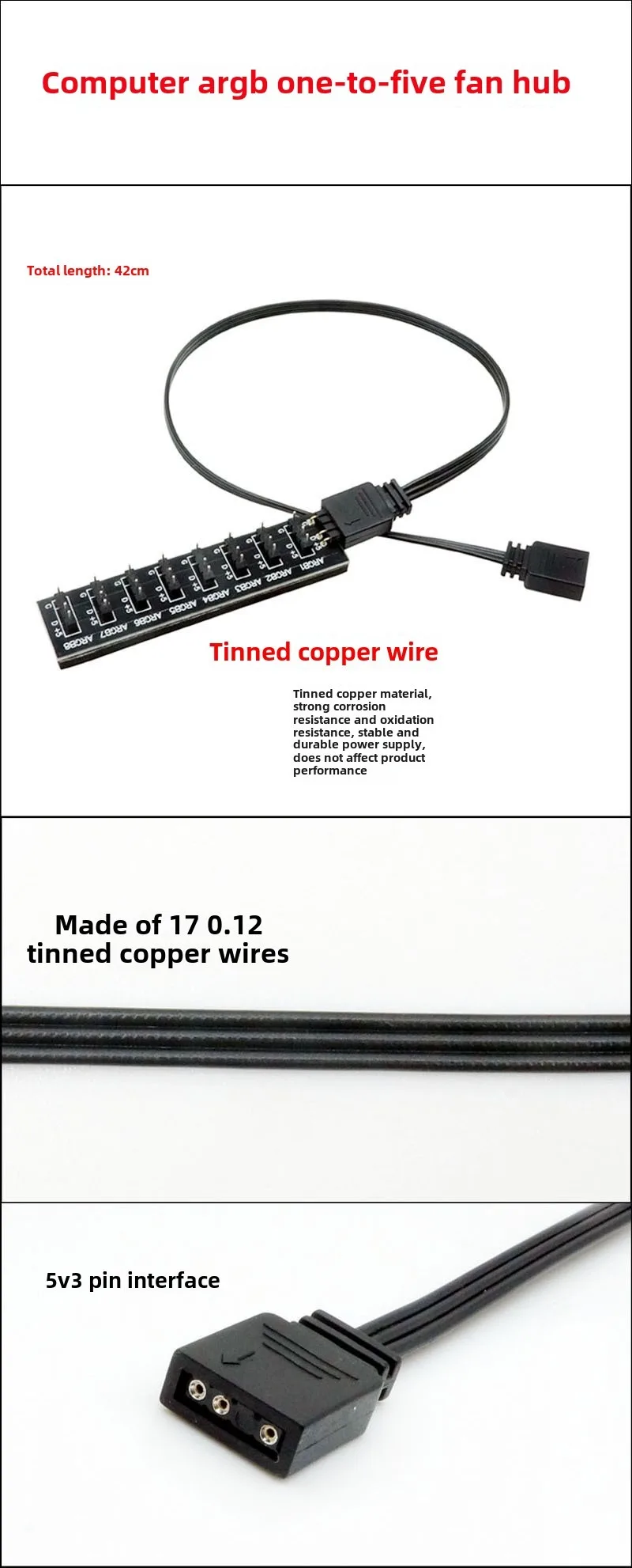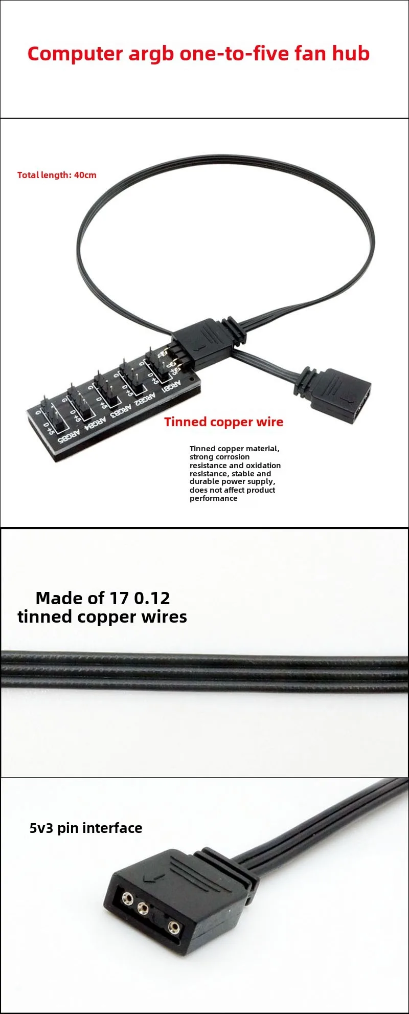 [Nombre del producto]: Hub ARGB del ventilador de la computadora Longitud del cable: 35 cm (se pueden personalizar otros tamaños) [Modelo de cable]: 1007 22AWG [Especificación del conductor]: 17 * 0,12TS 【Material del conductor】: cobre estañado Diámetro exterior del cable: OD1,6 mm*3 [Interfaz del producto]: Interfaz de 3 pines de sincronización de luz de ventilador ARGB de la caja de la computadora [Función del producto]: Habilite cinco ventiladores ARGB en una computadora para compartir una sola interfaz