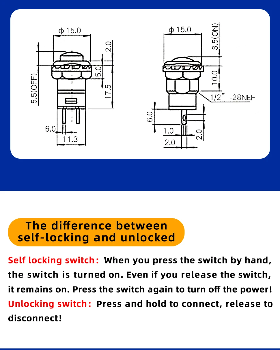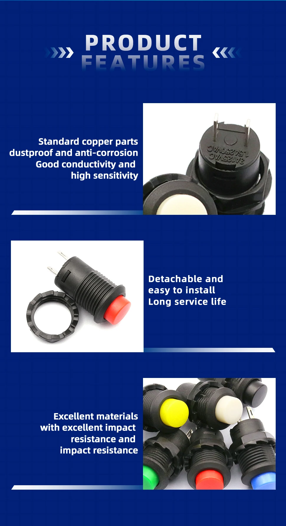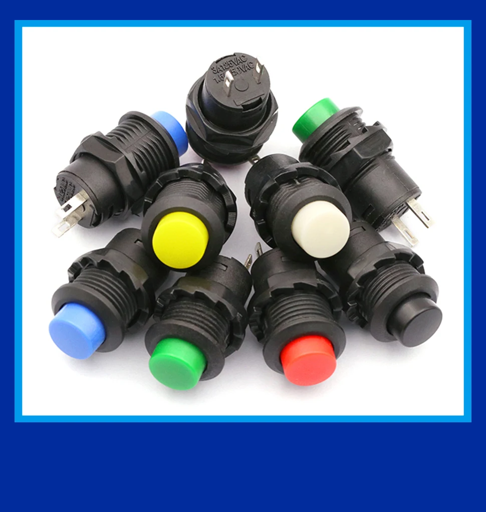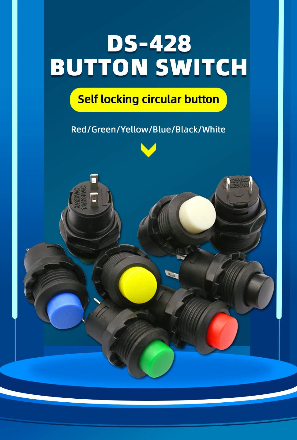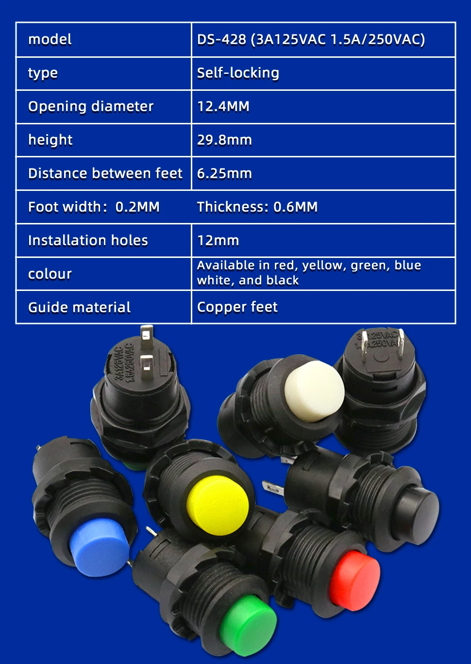 6 uds DS-428/427 PBS-11B 12MM interruptor de botón de plástico autoblocante momentáneo 3A 125V 1.5A 250V AC 2 pines 6 colores