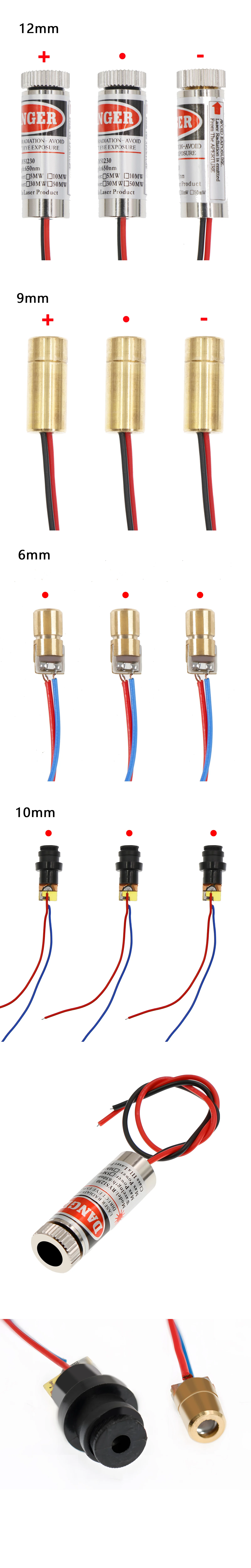 Parámetro técnico Modelo: LD-G650A03 Salida: 650 nm Longitud de la línea: 135 mm (12 mm) / 135 mm (9 mm) / 70 mm (6 mm) / 70 mm (10 mm) Voltaje: 3,0 V-5 V Corriente: 40 mA (máx.) 808nm 500mw +/-3nm 5 6mm Diodo láser de tubo láser infrarrojo cercano fácil de cubrir Temperatura de trabajo: +10℃ ~ +40℃ Corriente de trabajo: 560 mA Corriente: 620mA Voltaje de funcionamiento: 2V Longitud de onda: 650 nm Potencia: 5mW Diámetro exterior: 6 mm Forma del láser: Cruz/Punto/Línea El cable rojo es el electrodo positivo. El cable negro es el electrodo negativo.