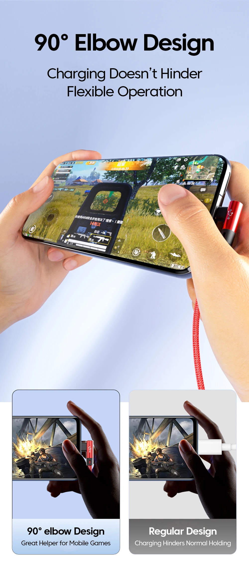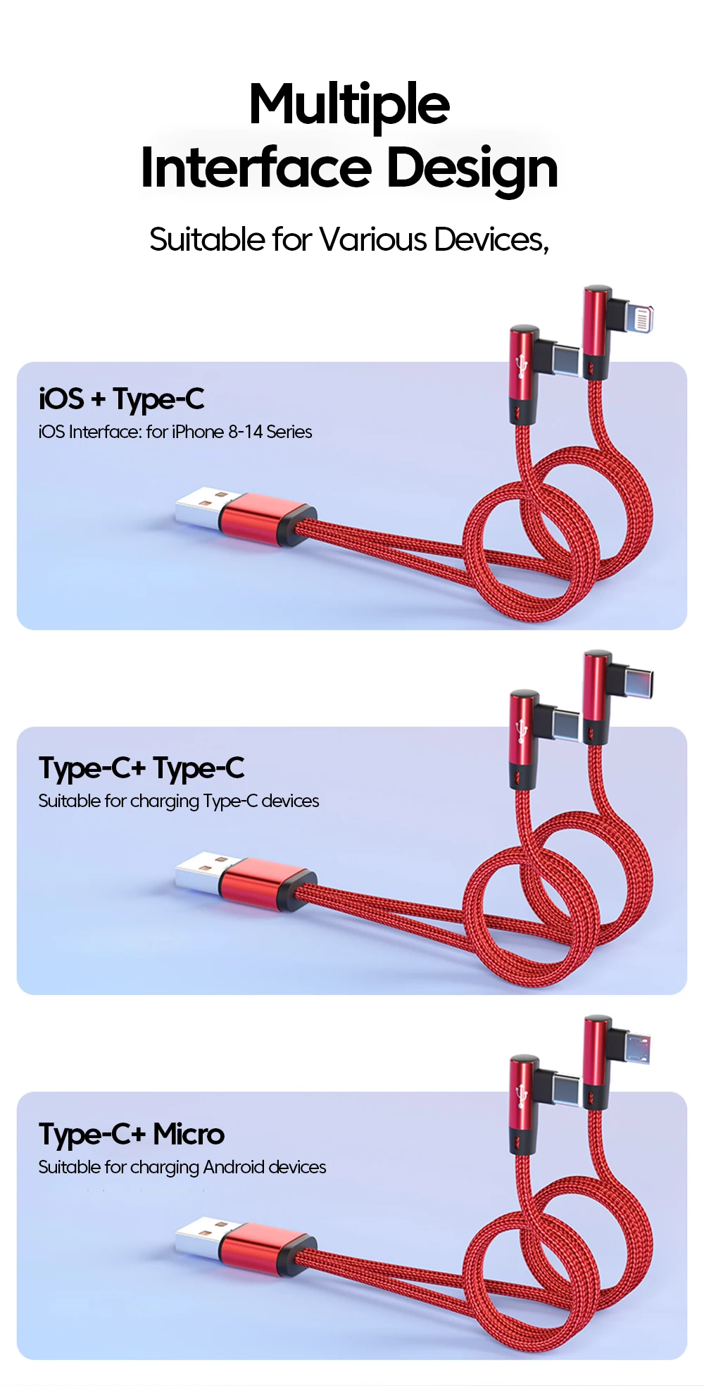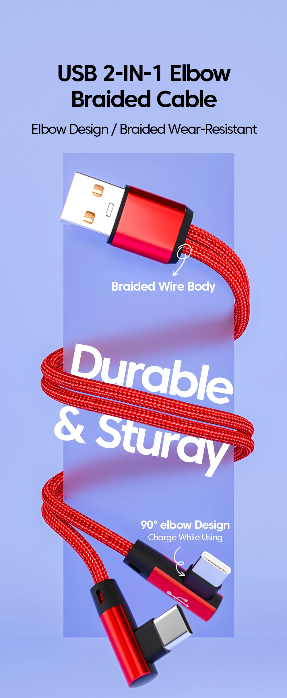 66W 2 en 1 USB A al cable dual tipo C de carga rápida 90 ° Cable Codo Para iPhone 15 Sumsung Huawei Xiaomi USB A USB C/Micro Cable