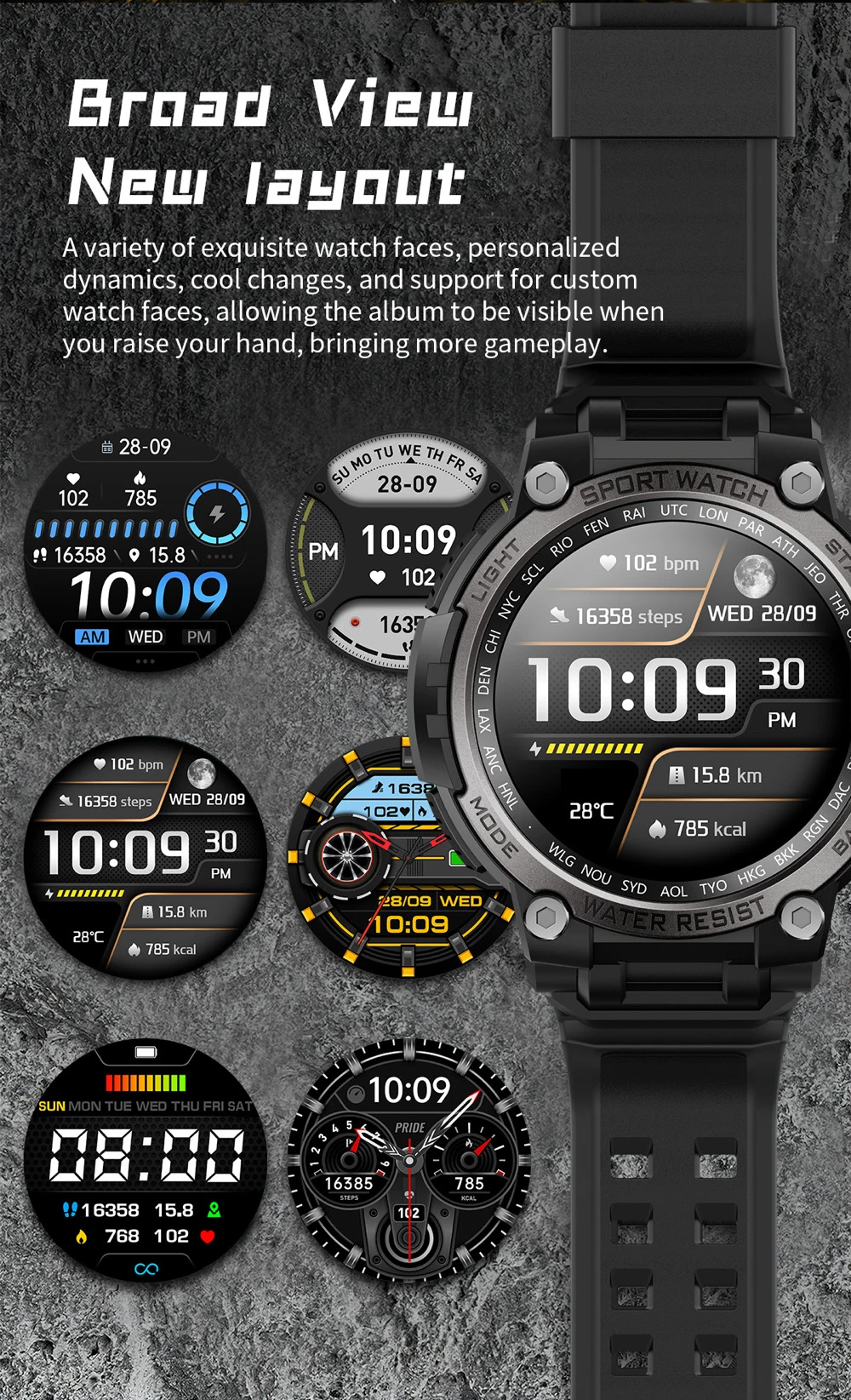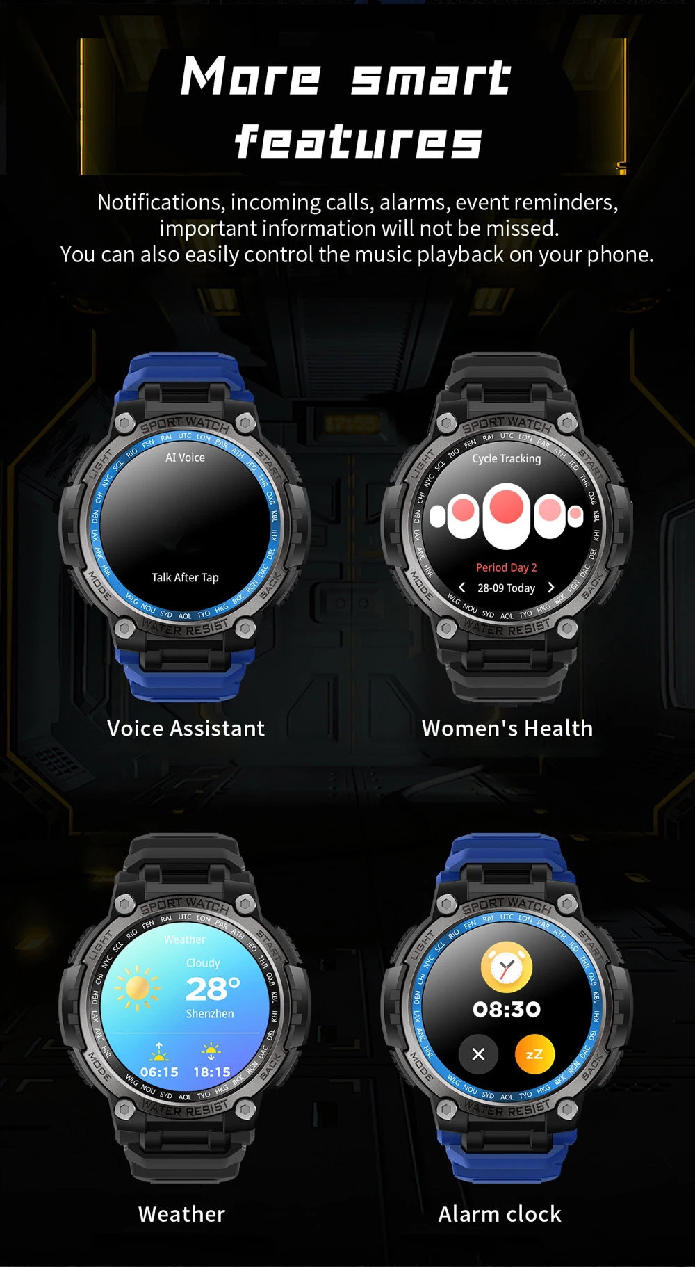 Llamada Bluetooth, contador de pasos, sueño, frecuencia cardíaca, presión arterial, oxígeno en sangre, brújula, recordatorio de llamadas, modo multideporte, selección de dial, cronómetro, control de música, recordatorio de sedentarismo, recordatorio de bebida, despertador, levante la mano para iluminar el pantalla, reemplazo de marcación, foto remota, clima, notificación por SMS del teléfono;WeChat, QQ, Facebook, Whatsapp y otros recordatorios de información de terceros;