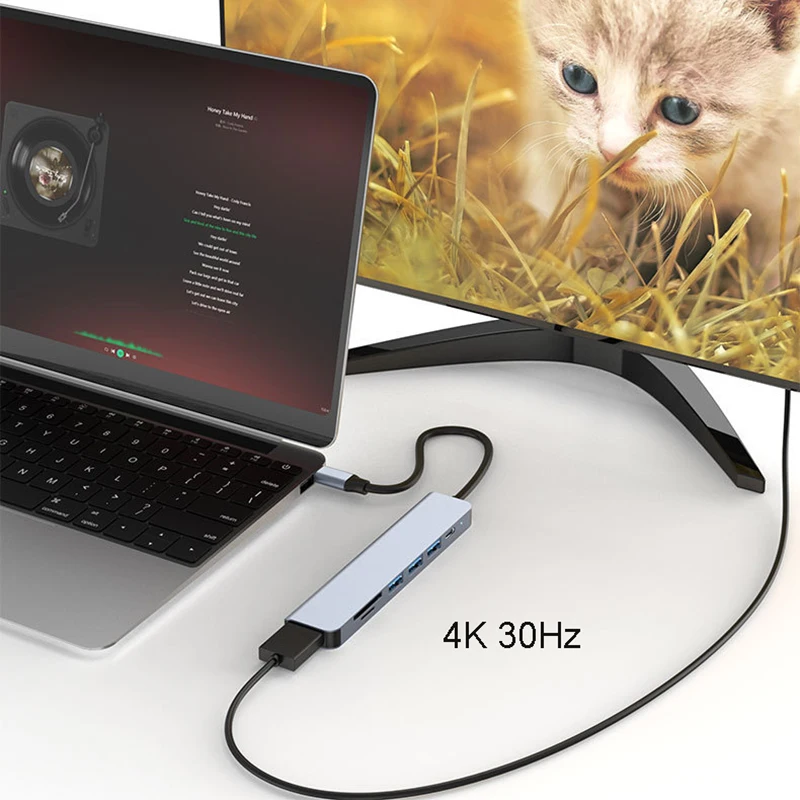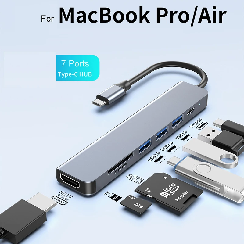 7 puertos con HDMI a tipo C HUB HDTV 4K30hZ Adaptador de pantalla de proyección PD 100W Dock de carga USB3.0 2.0 SD TF Lector de tarjetas para Macbook Pro Air Laptop
