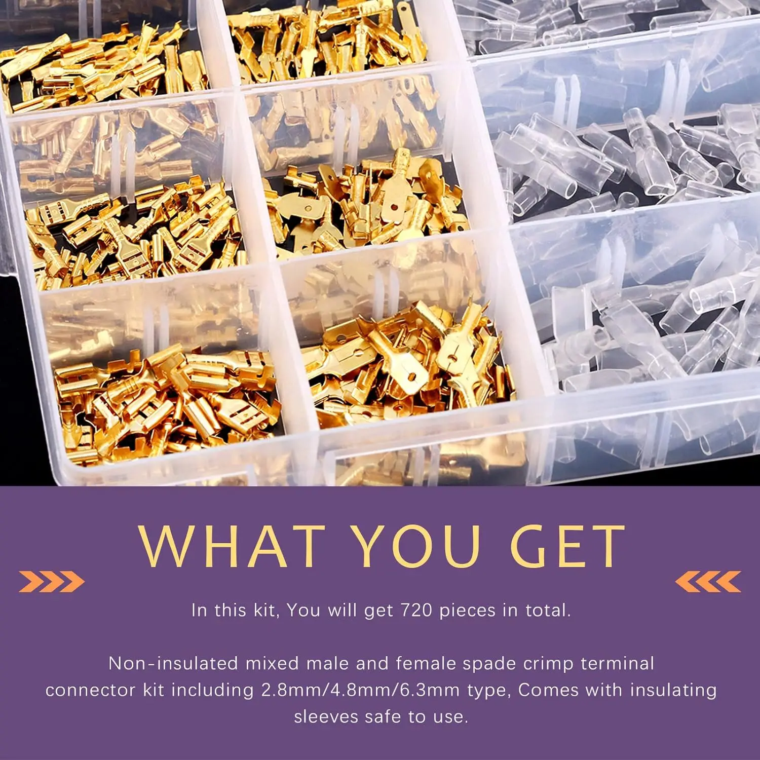 ✿ LO QUE OBTIENES ---- En este kit obtendrás 720 piezas en total. Kit de conector de terminal de engarce de pala macho y hembra mixto sin aislamiento que incluye tipo 2,8 mm/4,8 mm/6,3 mm, viene con fundas aislantes seguras de usar.